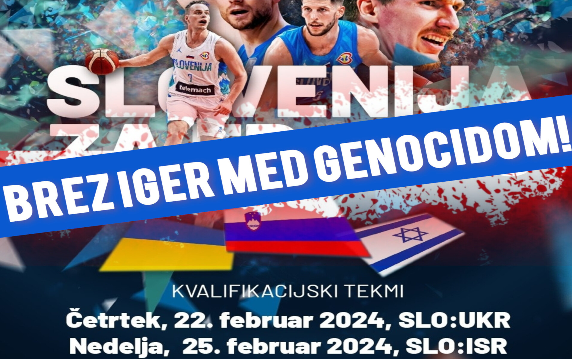 – V prvem delu poziv Solidarnostnega odbora za svobodno Palestino  BREZ IGER MED GENOCIDOM! – da se odpove košarkarsko tekmo med slovenijo in izrahellom, ki je napovedana za konec februarja v Kopru.