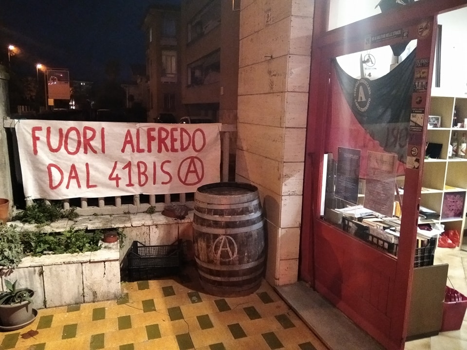 Alfredo Cospito že od leta 2014 prestaja dolgoletno zaporno kazen, na katero je bil obsojenj zaradi streljanja v noge Roberta Adinolfija, direktorja podjetja Ansaldo Nucleare, ki proizvaja in izvaža jedrske elektrarne. Alfredo je bil maja letos premeščen v zapor Bancali na Sardiniji, kjer je podvržen posebnemu režimu bivanja, ki je znan pod imenom '41-bis'. Ta režim pomeni, da se zapornik znotraj zapora praktično nahaja v še enem zaporu. Ne samo, da je zapornik popolnoma odrezan od zunanjega sveta in 22 ur na dan preživi v samici, prav tako nima dostopa do nobenih aktivnosti in do rehabilitacijskih ter integracijskih programov.