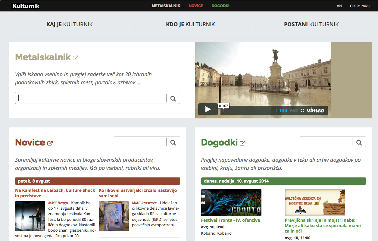 Slovenija je bogatejša za Kulturnik.si, portal Ministrstva za kulturo Republike Slovenije, ki uporabnikom omogoča temeljit pregled dogajanja v slovenski kulturi in umetnosti bodisi v obliki novic bodisi v obliki dogodkovnika, hkrati pa s pomočjo metaiskalnika na strani uporabniki lahko dobijo izjemen vpogled v bogastvo, ki ga hranijo naše knjižnice, arhivi in muzeji.