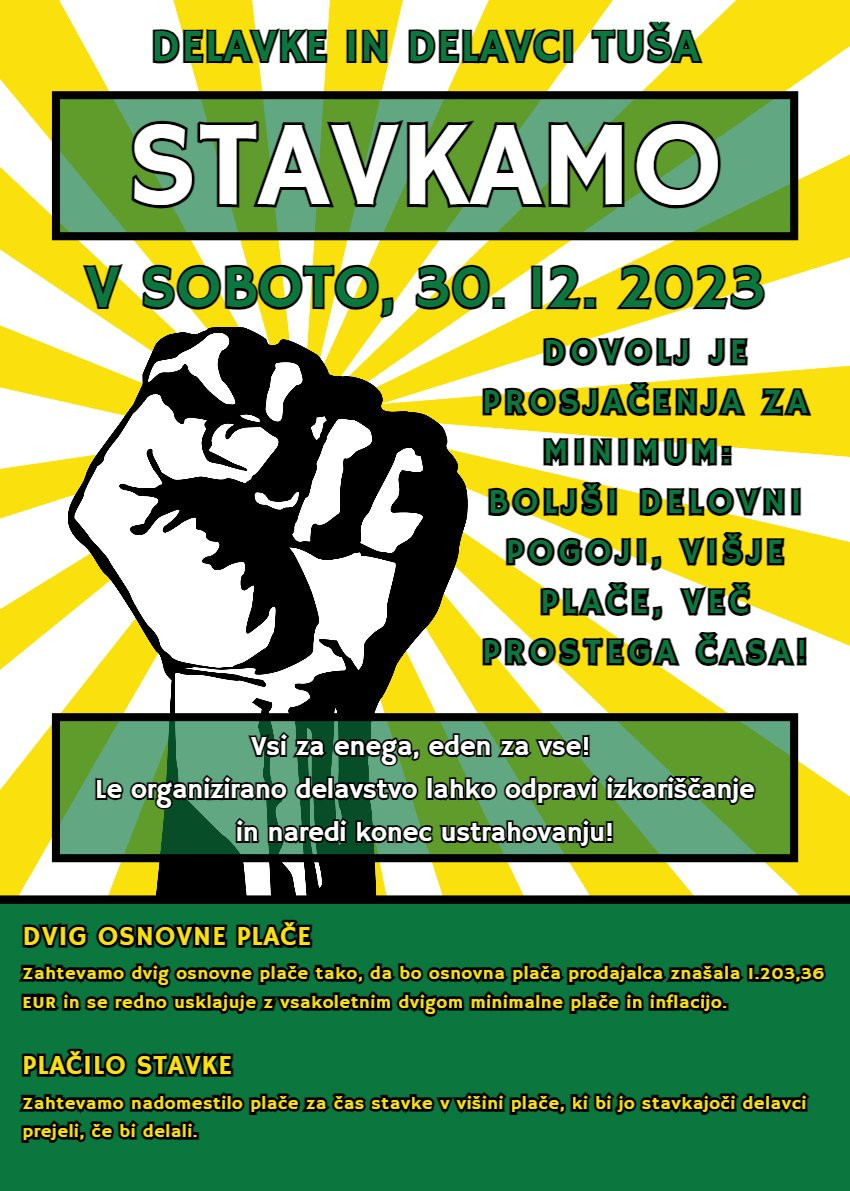 V kratkem se bo sklepala tudi nova kolektivna pogodba za trgovinsko dejavnost, v kateri je zaposlenih kar 100.000 delavk in delavcev. V njen uspeh, da vam zagotovi zaslužene delovne pogoje, zadosti prostega časa in dostojno plačilo, lahko verjamete zgolj, če boste za njenimi določili stali vsi delavci v panogi. Samo iz delavske solidarnosti lahko pričakujemo, da si boste priborili dostojno življenje.