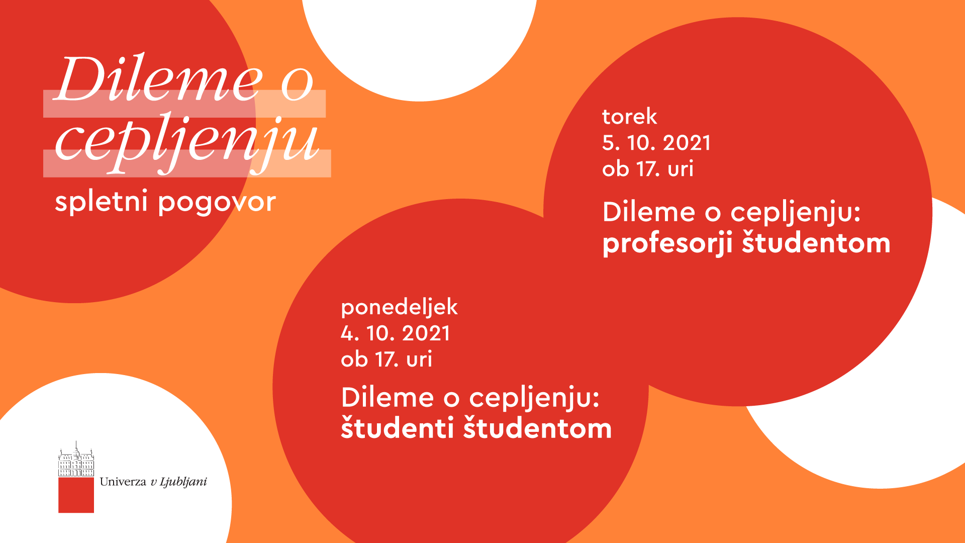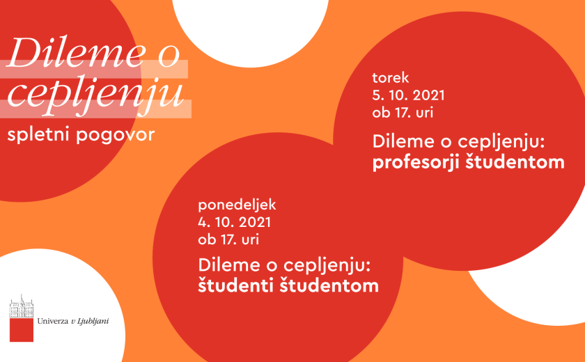 Ker na Univerzi v Ljubljani zaupamo v znanost in odprti dialog, bomo v ponedeljek in torek, 4. in 5. oktobra 2021, oba dneva ob 17. uri, organizirali spletna pogovora z naslovom Dileme o cepljenju. Ponedeljkov pogovor je namenjen predvsem študentkam in študentom, saj bodo sogovorniki študentke, študenti medicine in farmacije, torkov pogovor pa je namenjen vsem na Univerzi v Ljubljani in širši javnosti, saj bodo sogovorniki rektor in prorektorica Univerze v Ljubljani ter profesorica in profesorja Univerze, predstavnica in predstavnika medicinske in pravne stroke. Univerza v Ljubljani v sodelovanju z Zdravstvenim domom Ljubljana organizira tudi cepljenje za študentke, študente in zaposlene. Več informacij najdete tukaj.