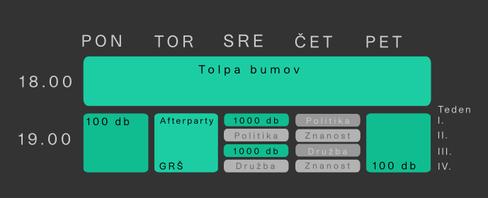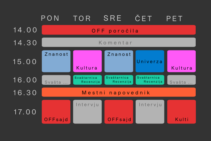 »Hard facts don’t care about your feelings.« V popoldanskem programu smo združili vse najaktualnejše, informativne in poglobljene oddaje. Zasnovali smo ga tako, da bo čimbolj predvidljiv, obenem pa bo našim redakcijam ponujal več časa, da bodo lahko v vsako temo zagrizle še globlje in o njej razpredale dlje. Začenjal se bo ob 14. in končeval ob 18. uri. Natančnejši razpored je ilustriran v spodnji tabeli.