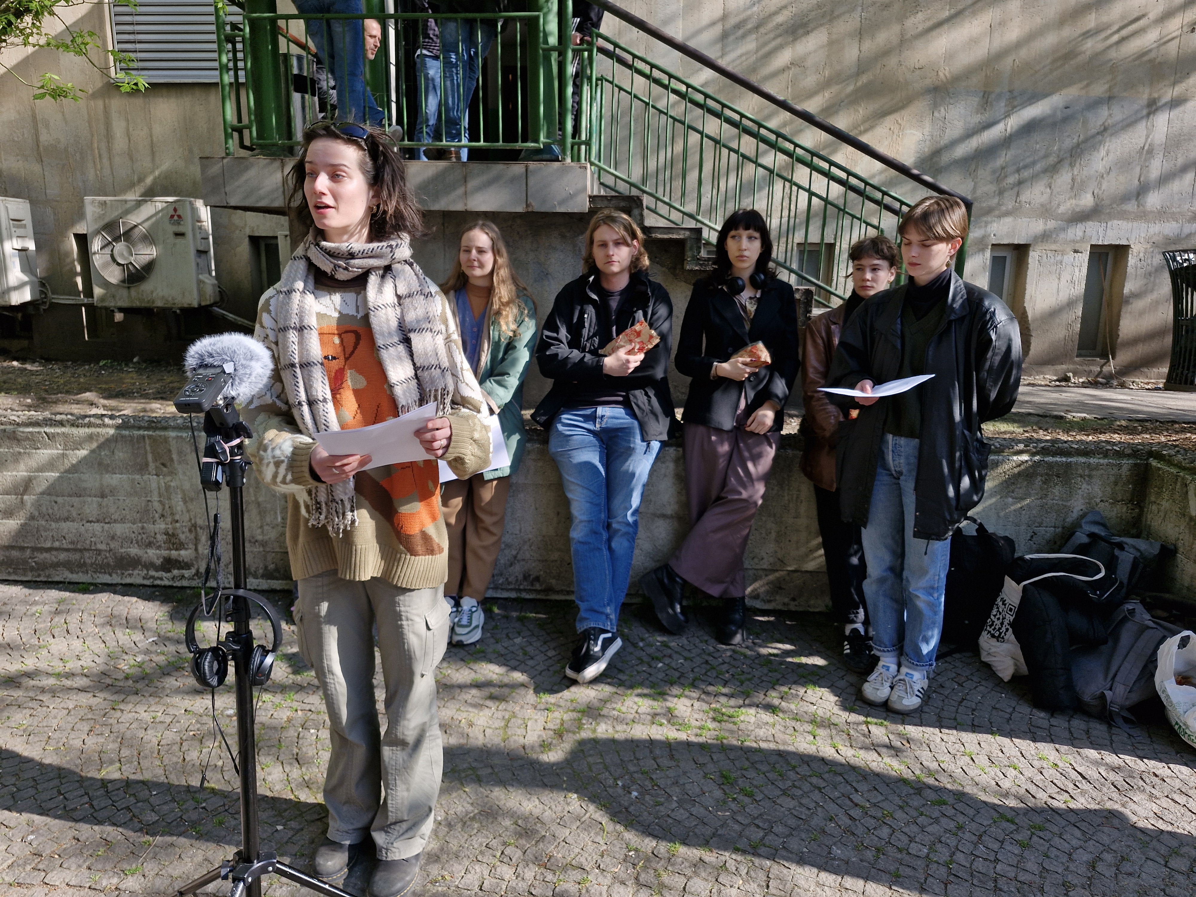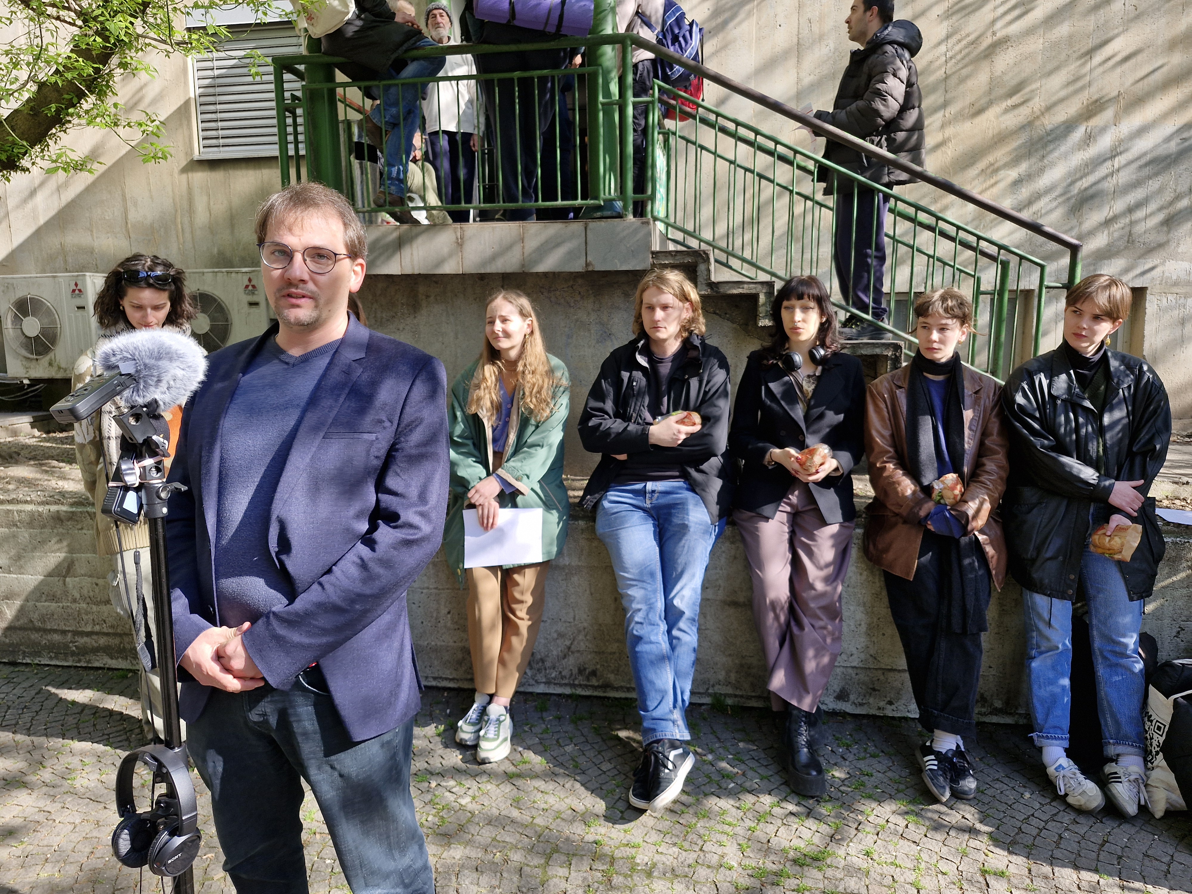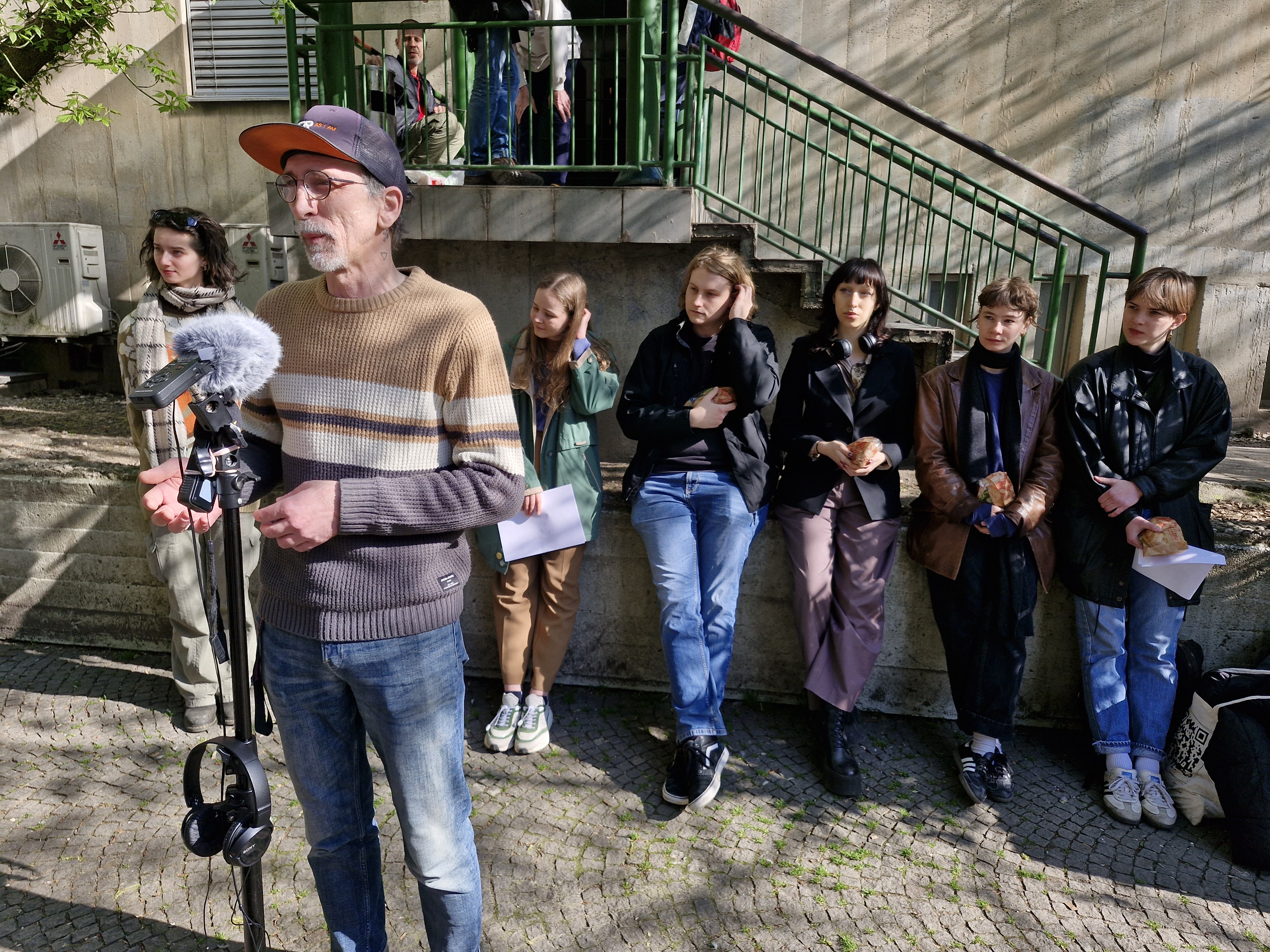 Zdaj se nas je vendarle nabralo za tedensko povprečje, prišle so še tri študentke in en študent (Tina pravi, da je to običajno in da se akcije udeležuje več študentk kot študentov.) Z zbranimi sendviči se torej odpravimo na kratko pot do Pražakove ulice 6, kjer ‒ nasproti Nobla in Slovenske kinoteke ‒ domujejo Kralji ulice. Vmes z vprašanji nevljudno napadem edinega študenta. »Ponudbe se hitro prenaješ,« komentira stanje študentske prehrane, »sploh v okrožju faksa, na katerem študiraš.« Tudi njemu ostane več subvencij, kot jih porabi.