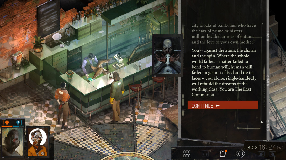 Kot je za pričakovati od igre z odprtim svetom, nas Disco Elysium ne sili v takojšnje opravljanje dolžnosti za fašistični varnostno-policijski aparat, tako da smo frej pri raziskovanju lokalnega života, v katerem se lepo zrcalijo blodnje preteklih in sodobnih politik na planetu Zemlja. Po propadu komune fiktivnega historičnega materialista Kras Mazova so kot dežurni levičarji ostali le še socialdemokrati in wanna-be socialisti, moralisti in ultraliberalci pa s svojo »by the book« dogmo ne morejo zakriti brezjajčne centristične pozicije, ki je dandanes kvečjemu samo še izgovor za boomerski status quo. Ker pa je stvaritelj igre, Robert Kurvitz, navsezadnje v postsocialistični kolonijici živeč leninist, srečamo nemalo pikrih komentarjev tudi na račun dogme znanstvenosti sovjetskega socializma. Ti cel čas plavajo v mejah očitnega simpatiziranja s komunističnimi pozicijami, saj igra ne moralizira o brutalnosti Kras Mazove komune in njenega režima, ampak igralce žene v preizpraševanje konkretne implementacije njenih parol kot ključnega odgovora, ki bi nam razjasnil trenutno apolitično ledeno dobo zaspanega mesta Revachol.