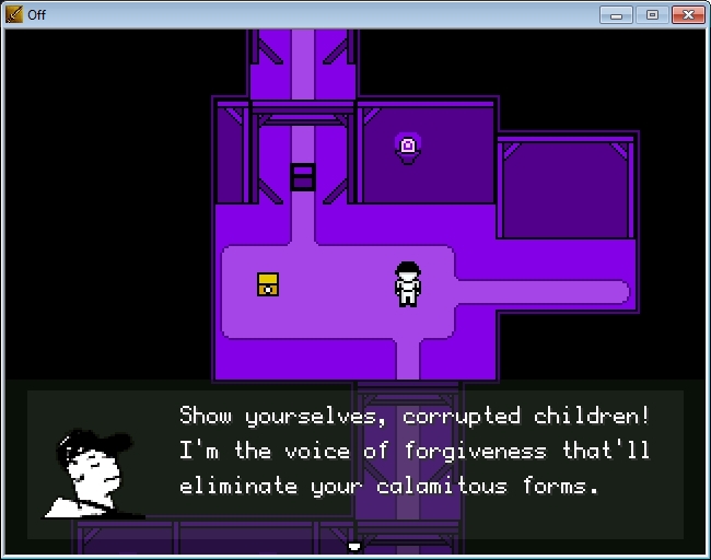 »Kdo si?« vpraša pikselaška mačka, samozvana Sodnik, ki se ob tem reži kot pečen maček. Oseba v belem z bejzbolsko čepico na glavi pogleda pojavo in odgovori, da je Odbijalec, ki bo izpolnil svojo sveto dolžnost. A maček ne nagovarja lika, temveč njegovega lutkarja. Ve, da nekje onkraj ekrana plava inteligibilna prikazen, tisti, ki nadzoruje dogajanje. Že v prvi sekvenci se raztrešči četrti zid, igralec je vanj potegnjen kot element dogajanja in prične svojo pot v čudnost špila OFF.