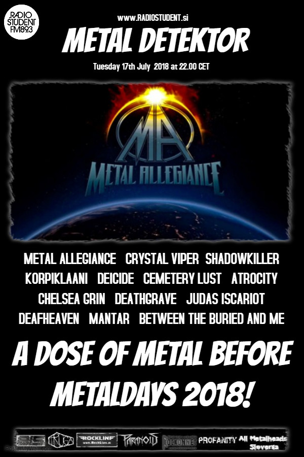 Danes različne metalske stvari - novi single all-star zasedbe Metal Allegiance, prav tako novi single kultnih death metal satanistov Deicide. Nov EP pripravljajo poljski power metalci Crystal Viper, nov album in prijetno presenečenje predstavlja power-prog trio Shadowkiller.
