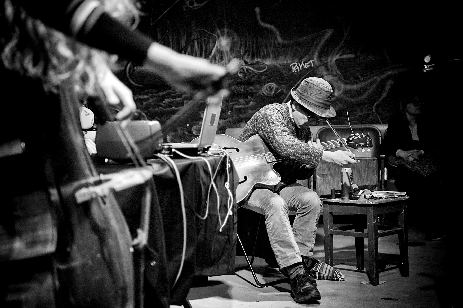 Po kratki čik pavzi je sledil še nastop tria Sugimoto / Dupleix / Bazelaire, že nagovor organizatorja pred pričetkom koncerta pa je nakazal, da bo šlo za precej drugačno žival muzik kot v primeru prvega koncerta večera. Glasbeniki tokrat niso bili ozvočeni in očitno je bilo, da se bomo v smislu dinamičnega spektra preselili med precej tišje plasti zvočenja. Glavnino zvoka, oziroma bolje rečeno njegovo podstat, je generiral Léo Dupleix z računalnikom in enim Genelec zvočnikom, iz katerega so prihajali različni subtilni droni, precej intonirane narave in nizke jakosti, zaradi česar so kdaj komaj opazno izginili in se kasneje prikrito zopet pojavili. Nad žametno podlago dronov sta zvoke nežno plastila Félicie Bazelaire s kontrabasom in Taku Sugimoto z akustično kitaro. Bazelaire je svoj kontrabas masirala z različnimi načini razširjenih tehnik, od igranja po telesu inštrumenta do interakcij s kobilico inštrumenta, Sugimoto pa se je večji del koncerta poigraval s flažoleti oziroma je z njimi perkusivno harmoniziral Dupleixove drone. Zvočna slika je bila, še posebej v primerjavi s koncertom dua Tomažin / Grom, zelo prazna. Glavno vlogo je prevzela tišina, kar je sicer v veliki meri modus operandi Takuja Sugimota že zadnjih deset do petnajst let. Za občutek - večina koncerta je bila tako tiha, da je recenzenta vedno bolj motil šum iz Gromkinih zvočnikov, ki sicer niso služili ozvočenju, a njihovi ojačevalci očitno niso bili izklopljeni, tu in tam pa je pozornost skorajda ukradel tudi občasen vdor zvoka koncerta iz sosednje Menze. Še toliko bolj je akuzmatično doživetje koncerta zmotila grupa ljudi, ki je v prostor vstopila sredi koncerta in z odpiranjem pločevink piva skrbela za spastične motnje v zvočnosti, eden izmed njih pa je imel očitno tudi nezadržno željo po komentiranju in je tako celotni zvočni sliki vlil še svoj pritajen šepet, ki je bil v razmerju s siceršnjo glasnostjo koncerta dejansko enakovreden ostalim inštrumentom, celotna kompozicija pa je s tem dobila dodaten, nepredviden in relativno moteč element. Zvočna meditacija tria je trajala 45 minut in se zaključila z odzvanjajočimi akordi Sugimotove kitare.