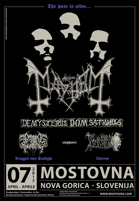 Kdor vsaj malo pozna black metal sceno, ve, da je eden izmed temeljnih albumov te zvrsti in scene prav leta 1994 izdan album De Mysteriis Dom Sathanas. In kdor je vsaj malo s svojim črnim srcem del te scene, mu je le-to poskočilo ob novici, da bodo Mayhem na rodni grudi album odigrali v celoti in to ovekovečili v obliki live plošče in DVD-ja, ki sta oba potem bila izdana decembra lani prek samih Mayhem, in sicer pod naslovom De Mysteriis Dom Sathanas Alive. Live album smo tudi nedavno predstavili v oddaji RŠ Koncert. A kadar bije črno srce, potem bije močno, zato se je vse glasneje začela izražati zahteva, da bi Mayhem dotični album odigrali še kje in kar se je sprva zdelo nemogoče, je postalo mogoče – The True Mayhem so se odločili posvetiti nekaj mesecev igranju omenjene plošče v celoti v različnih krajih – in eden teh krajev je bil tudi Nova Gorica.