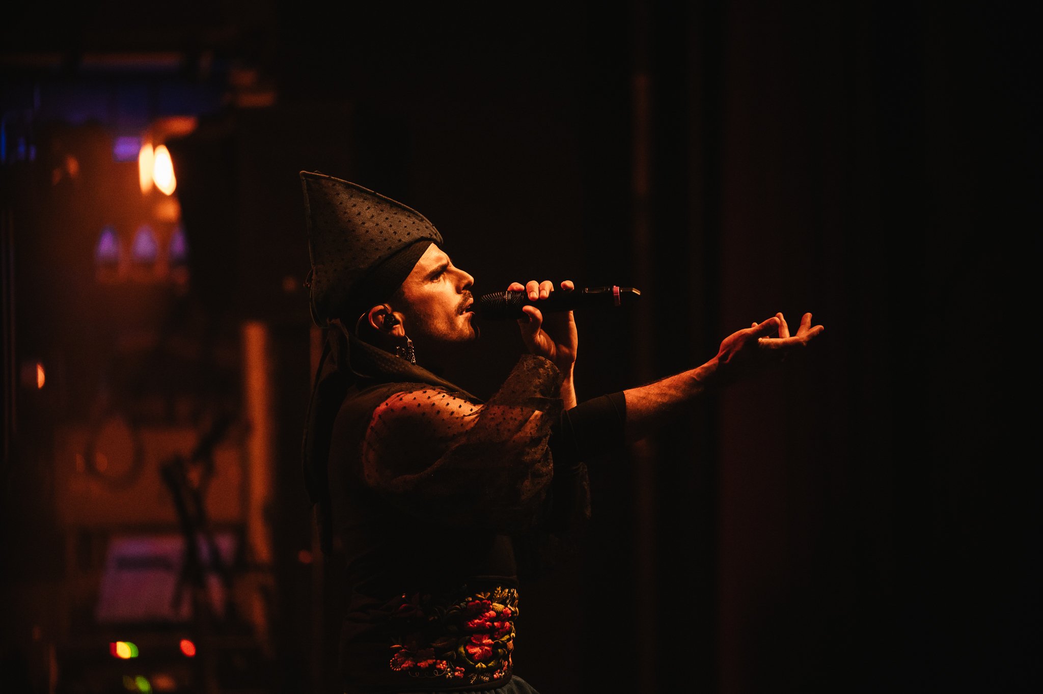 S svojo prikupno polomljeno angleščino, pri kateri mu je pomagala Quintana, nas je vodil po različnih kotičkih svojega univerzuma, ki so ga navdihnile modrosti asturijskih prednikov. Zgodbe, s katerimi je napovedal izvedbo posamičnih skladb, so včasih krepko presegle dolžino komadov. Pripovedoval je o revnih pletilcih košar, ki niso več prepoznali razlike med kašljem in lakoto, in postavnih starodavnih vaquerosih, po domače kavbojih oziroma pastirjih, ki nam jih je predstavil s seksualno nabitim tonom. Preko zabavne in vživete uprizoritve dvorjenja med njegovo bodočo babico in dedkom, ki sta drug drugemu posvetila hrepenenja polni pesmi z in izpod balkona, nas je opozoril na pozabljeno umetnost zapeljevanja. Spomnil nas je na žalostno stanje flirtanja v času Tinderja in nas spodbudil, da se v življenju malo resneje posvečamo tej plemeniti, skoraj pozabljeni umetnosti. Publiko je spraševal, kako se ob staroverskih obredih oglašajo starejše slovenske gospe. Od prvotno pričakovano zadržane dvorane je šele po prefinjenem zbadanju dobil želeno reakcijo v obliki ritualističnga vriskanja in nečloveškega oglašanja.
