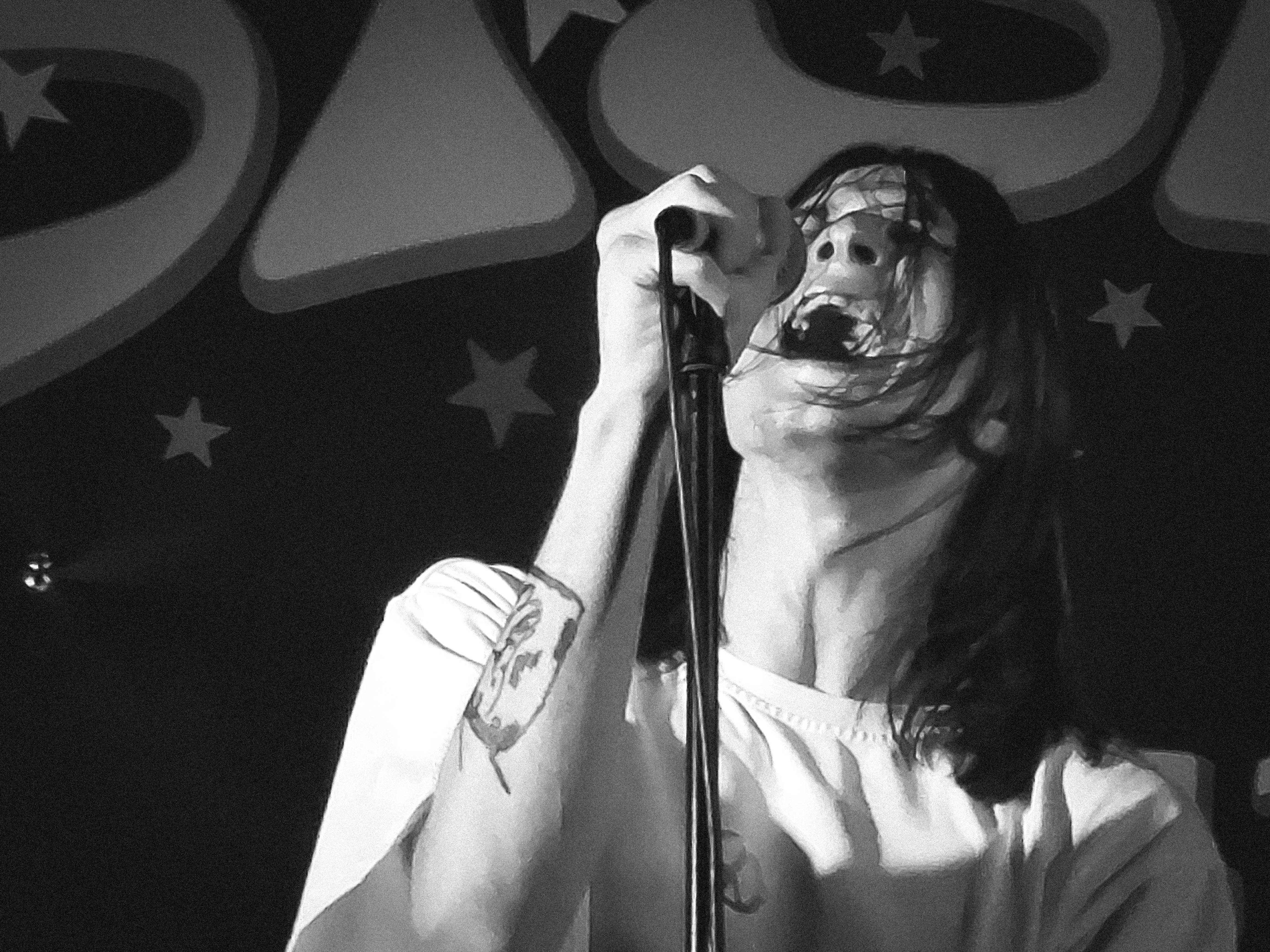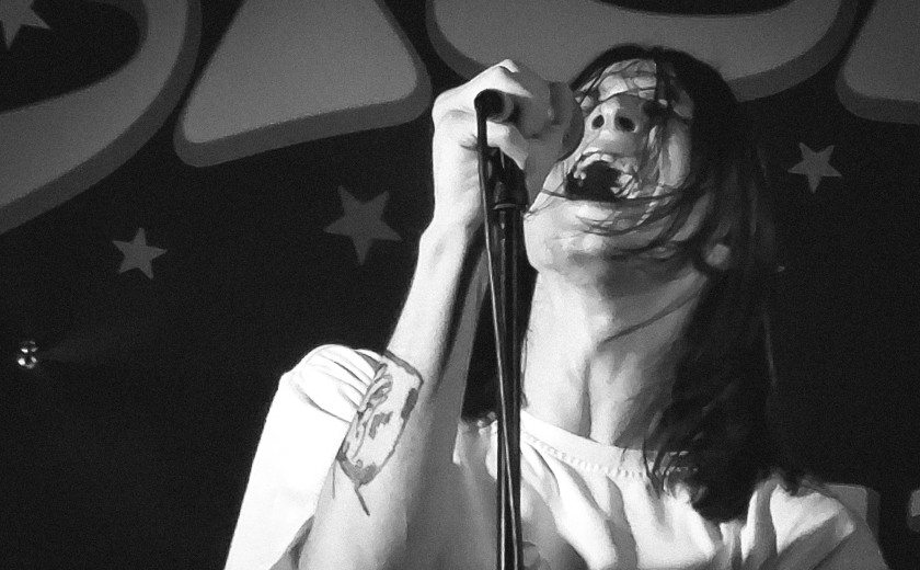 Koncert, ki je bil le dan prej zamaknjen za eno uro z osme na deveto, je lagano – tako kot večina obiskovalcev koncerta za mizicami – s čikom v ustih in pivom v roki odprl Dmitrijev kolega za mešalko. A ogrevanje je bilo kratko, z enournim zamikom koncerta na deveto se nam je vendarle obetal relativno kratek, maksimalno 60-minutni nastop, v katerem ni časa za rajcanje publike. Zaradi tega je Dmitrij po kratkem inštrumentalnem uvodu svojega tovariša krepko zgrabil mikrofon in vanj še krepkeje iz svojih globočin začel kričeče zlivati svoje frustracije. S svojo primalno intenziteto in agresivnim loputanjem po bobnu, kot so to včasih počeli hrupni pobalini The Jesus and Mary Chain, je deloval kot popolno nasprotje svojega pajdaša. Ta je za mešalko skrbel za nasnete matrice krutih EBM-ovskih ritmov, zakopanih pod hrupnimi sloji industriala, pirčkal in kot zagnan DJ z občasnim mahanjem roke po zraku spodbujal kopico najbolj pogumnih, ki so vstali od mizic in se proti koncu koncerta, neznačilno za sramežljivo slovensko publiko, celo premaknili čisto do samega odra.