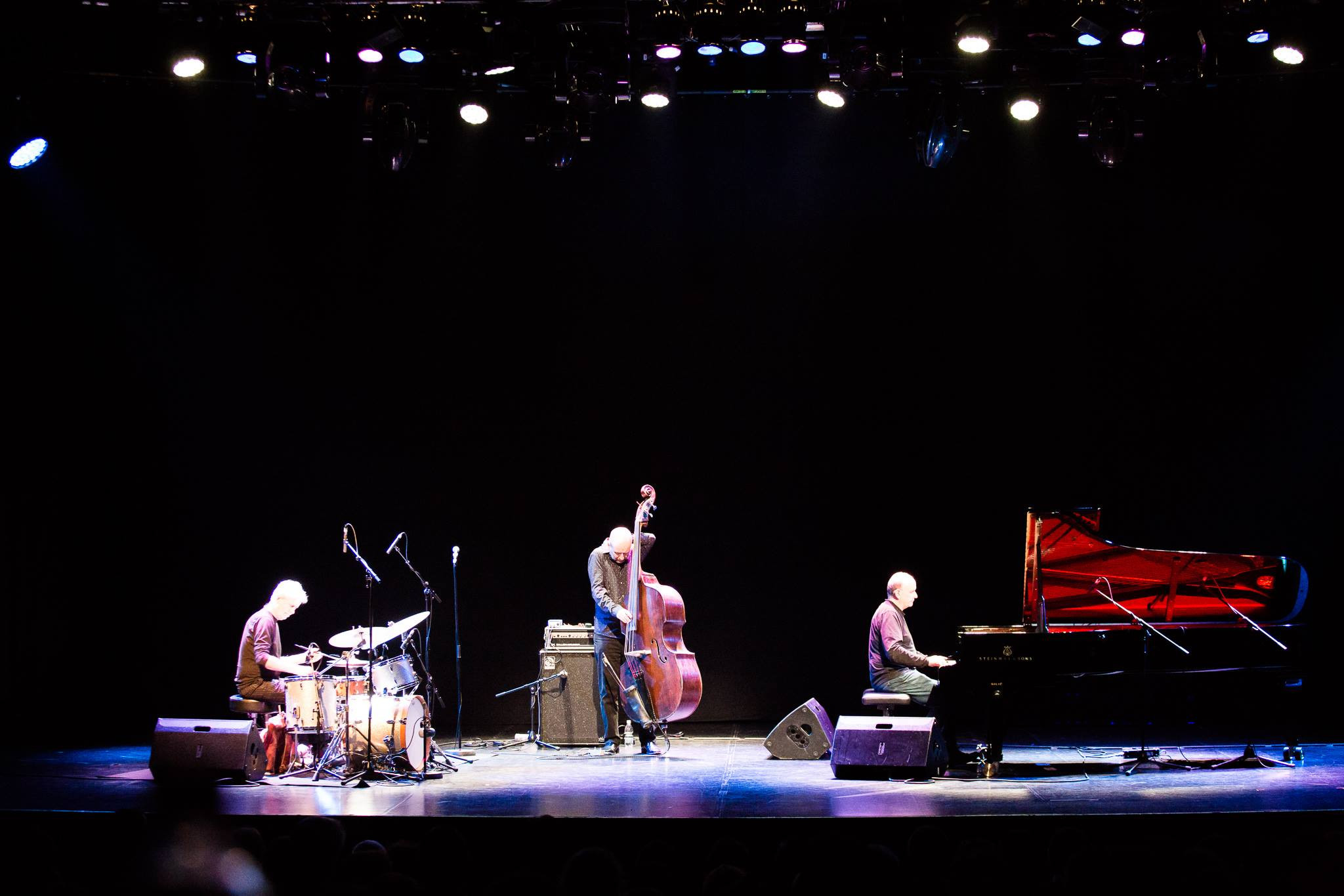 Počasno vožnjo prvega seta je otvorilo prasketanje po bobnih. V tem, kako se vsak izmed nastopajočih počasi in subtilno priklopi na glasbeni vlak, je določen čar. Vstopi so komaj slišni, nato pa zvenijo, kot bi bili že ves čas tam. Le, da se jih prej ni slišalo. V tem primeru tihega rohnenja kontrabasa in zvočne zavese klavirja, ki je nežno deževal v ozadju. Vožnja se je mikroskopsko stopnjevala, razvijala, a nikoli dosegla vrhunca. Vseskozi smo bili ujeti v polsen s spretnim sinusoidnim vijuganjem med zvoki plavajoče trojice. Videlo ter slišalo se je, da igrajo drug z drugim že več desetletij, saj so v improvizaciji brezšivno prehajali ter drug drugega elegantno in gladko spuščali v ospredje.