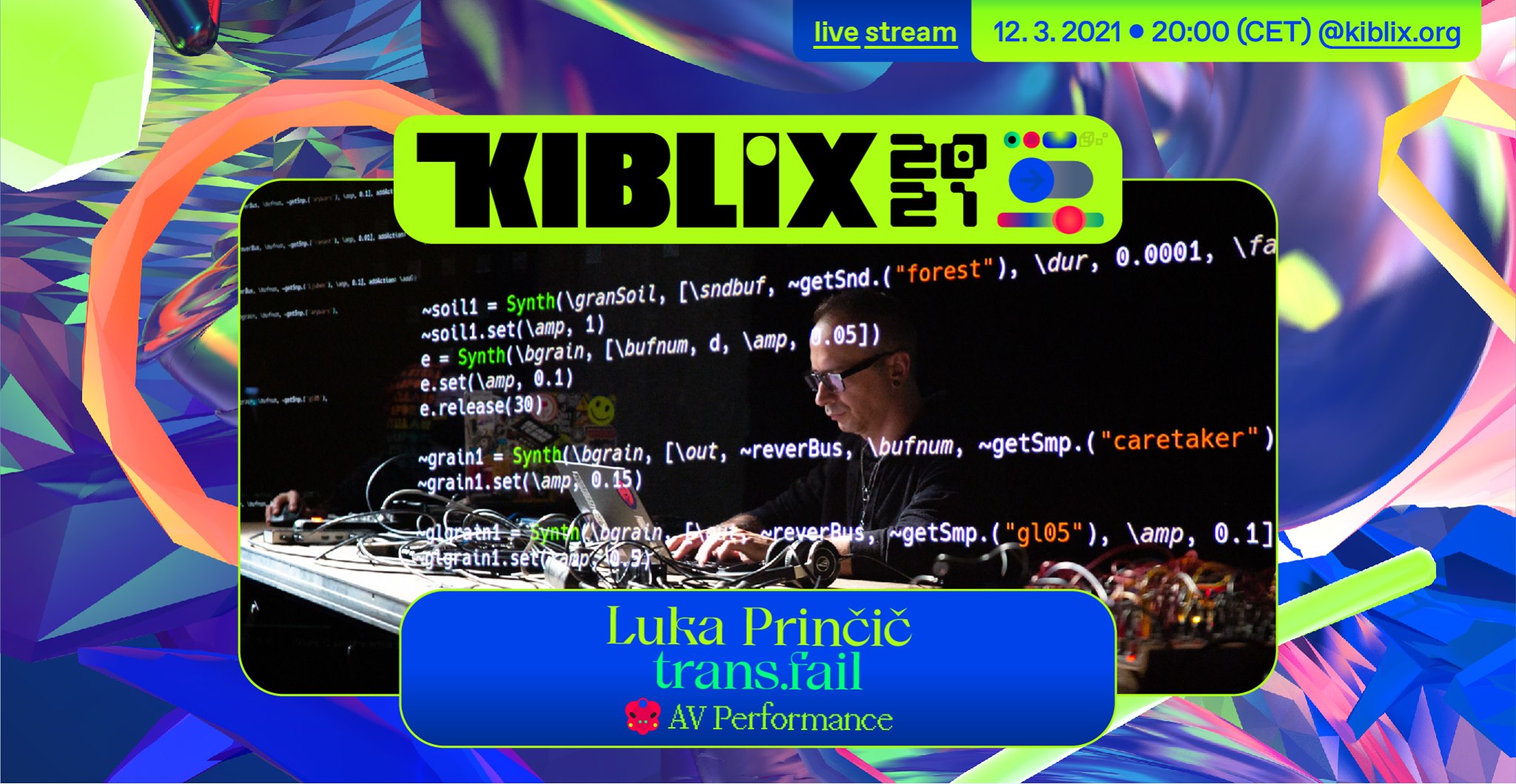 V petek, 11. marca 2021, bo ob 20. uri na festivalu Kiblix preko streama nastopil slovenski intermedijski umetnik Luka Prinčič, ki bo predstavljal svoj audiovizualni performans trans.fail.