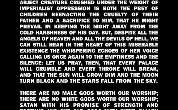 In ravno to kričanje v svoji potopljenosti, domačnosti in obenem nerazpoznavnosti, nas vodi v okultno formulo plošče. Ugotavljanje in spodbujanje propada, priznanje votlosti konstrukcij preteklosti, ki ni bila to, kar bi naj bila ter prepustitev strahopetnih dejanj praznini, breznu, temi in hladu Velike Matere. Matere, ki jo kreacionistični miti, s končno dekadenco koncepcij v biblijski »genezi«, že od začetka prikažejo kot trpno, podjarmljeno, ukročeno. In posiljeno bi lahko dodali - Book Of Sand to doda, kot že na plošči »The Face Of The Waters«. Prepušča pa nas tistemu neizrečenemu in ne-esencialistično feminilnemu potencialu black metalskih telesno-psihološko-mitskih tehnik, ki v deliriju aglomeracije svojih tropov obljublja tako vrnitev kot potencial preobrazbe v nekaj drugega, starega in še-ne utelešenega, nekaj, kar bo zahtevalo destrukcijo zdajšnjega.