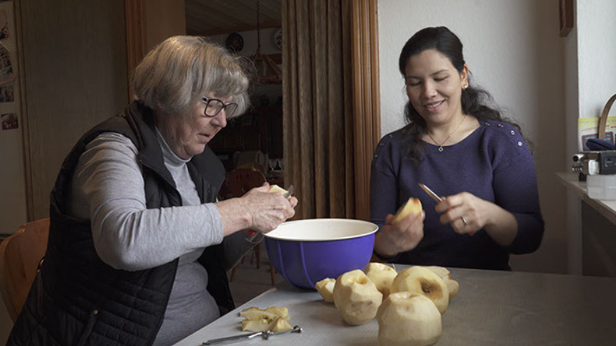 Prav zato je kuhinja tudi središče izmenjave nasvetov med starejšo in mlajšo priseljenko, med Metko in Soghro. Če je žensko delo nevidno, še ne pomeni, da produkt dela, pri katerem pride do menjave kultur, ni. Z Metkinimi besedami je nemška kuha postala zanimive šele ob prihodu priseljencev, med katerimi je bila tudi sama. Meni, da so bile nemške jedi pred tem dolgočasne in da so šele z dodatki pridobile nekaj zanimivega. V Odenwaldu so znani po svojem kochkäse, jedi iz sira, smetane in masla. Že s prvim navalom priseljencev v šestdesetih se je ta pojavil v nadgrajeni različici – kochkäse mit musik. Ta ima z dodatkom kumine in čebule pridih novih priseljencev, štajerska različica pa vključuje še bučno olje. Prav ta muzika je tisto, kar so priseljenke nekoč že prinesle. Prepričanje, da je izmenjava kultur tista, ki lahko nove in stare prebivalce države oplemeniti, je v filmu močno prisotno. Metka devet receptov kot žensko izročilo predaja režiserki, svoji nečakinji, kuharsko modrost pa predaja tudi Soghri, svoji afganistanski podnajemnici. Pa ne zgolj nemške, tudi slovensko!