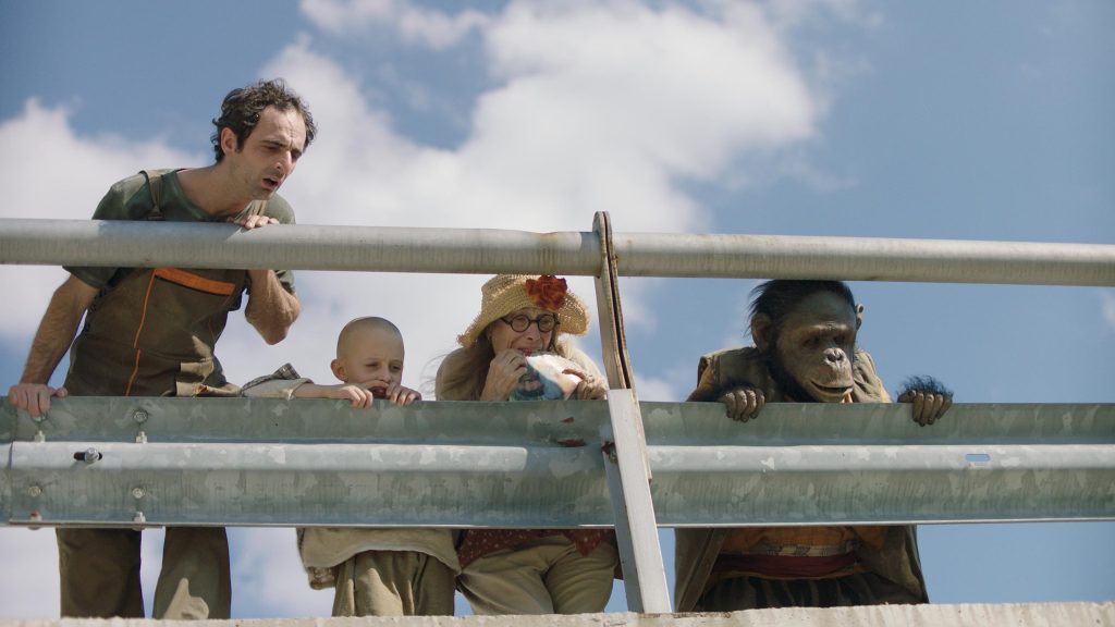 Mimogrede, opica v filmu ni resnična žival, ampak 40-kilogramska šimpanzja obleka s posebnim mehanizmom hlajenja in robotom za premikanje obraza, v katero je bil oblečen igralec, Britanec Peter Elliott. Pred snemanjem so namreč ugotovili, da sodobni zakoni ne dopuščajo, da bi se med snemanjem v kadru hkrati pojavila šimpanz in človek. Režiserju pa se je zdelo preveč prevarantsko, če bi cel film zlepil skupaj iz različnih kadrov.