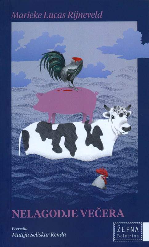 Prostrano morje, v njem, eden vrh drugega, krava, prašič in obglavljeni petelin. S to skrajno nenavadno sliko naslovne platnice se potopimo v žepnico Nelagodje večera nizozemskega pisatelja Mariekeja Lucasa Rijnevelda. Slovenski prevod Mateje Seliškar Kenda je letos izšel pri Beletrini.