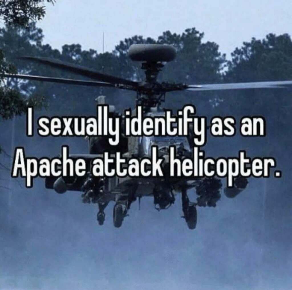 Isabel Fall je v znanstvenofantastični reviji Clarkesworld leta 2020 objavila kratko zgodbo, ki je bila prvotno naslovljena »I Sexually Identify as an Attack Helicopter«Nanaša se na spletno copypasto iz leta 2014, ki jo je napisal igralec videoigre Team Fortress 2. Uporabnik Guuse je tekst spisal kot satiro blogovskih objav transspolnih oseb, v katerih opisujejo svojo pogosto težavno izkušnjo tranzicije in življenja v nesprejemajoči družbi. Njihovo doživljanje parodira z izmišljeno zgodbo osebe, ki se identificira kot helikopter. Njegov namen je bil razvrednotiti tovrstne zapise, pokazati absurdnost ideje obstoja več spolov in dokončno zakoličiti svoje izključujoče prepričanje. Besedilo je tako v glavnem uporabljal kot avtomatiziran spam, s katerim je v klepetu igre zatiral vse pogovore, povezane z doživljanjem spola.
