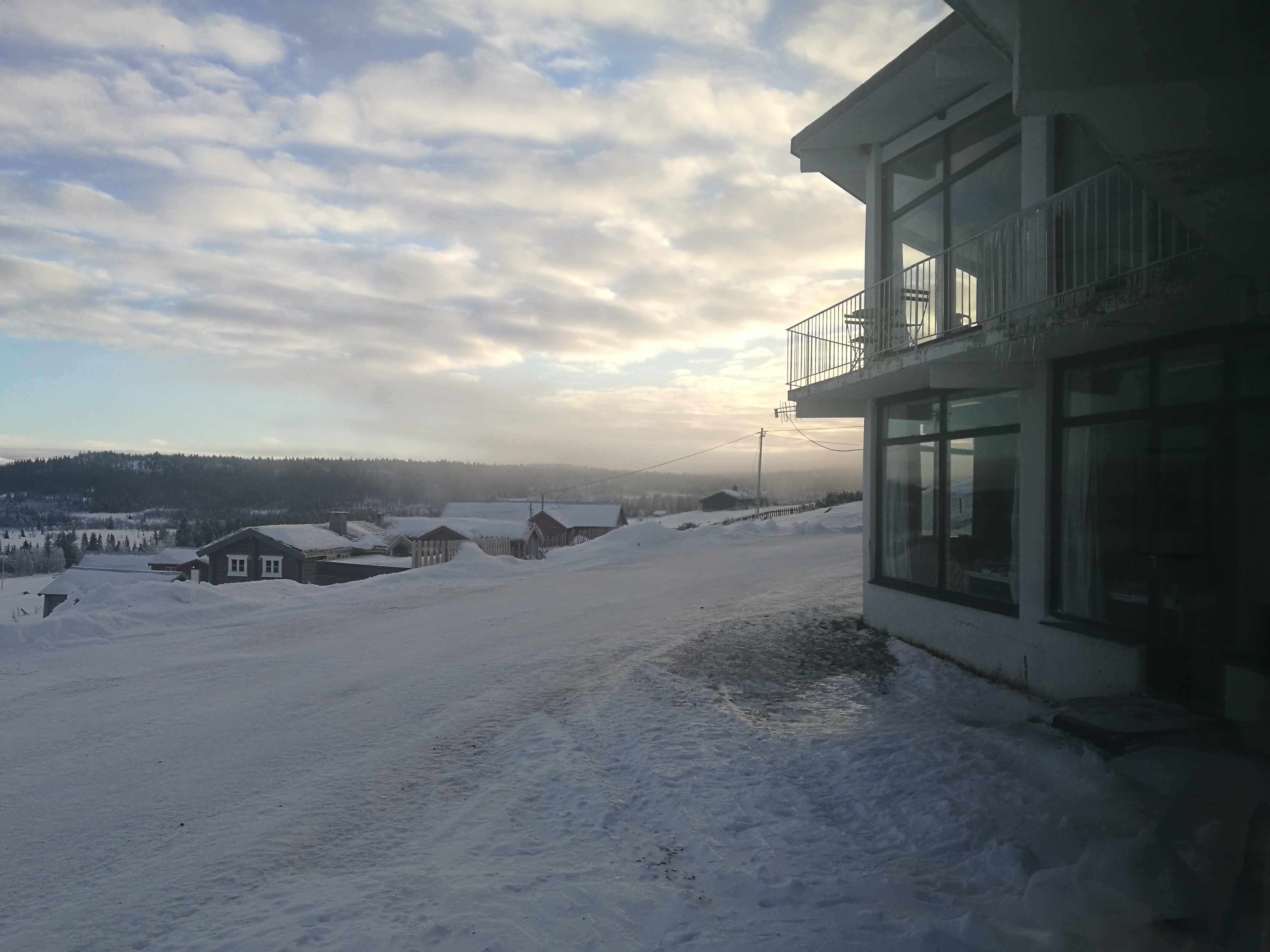 Hotel je zgrajen nedaleč stran od jezera, od koder se prične nežno vzpenjati vzpetina. Jezero je seveda v tem času zamrznjeno in zasneženo, neskončno belino pa razbija samo temno zelena barva iglavcev, ki so poleg občasnih brez edina vegetacija v tem času leta. Tempo naših dni smo prilagodili zimskemu ritmu življenja: dneva se pred deseto skorajda ne spodobi začeti. V Hornsjøju takrat namreč sonce prične svoj počasen in mukotrpen pohod po svojem izbranem koščku neba. Sončni vzhodi in zahodi so izjemnih barv in vsakič znova plenijo pozornost. Obenem so zelo nehvaležni za ljudi, ki smo navajeni smeri neba. Sonce vzide in nato po kratkem sprehodu čez nebo prične zahajati čisto blizu tega istega mesta. Verjeli ali ne, tudi po devetih dneh je to še zmeraj bil vir nepopisne fascinacije. Predvsem pa je izvrstno izhodišče za smalltalk o vremenu.