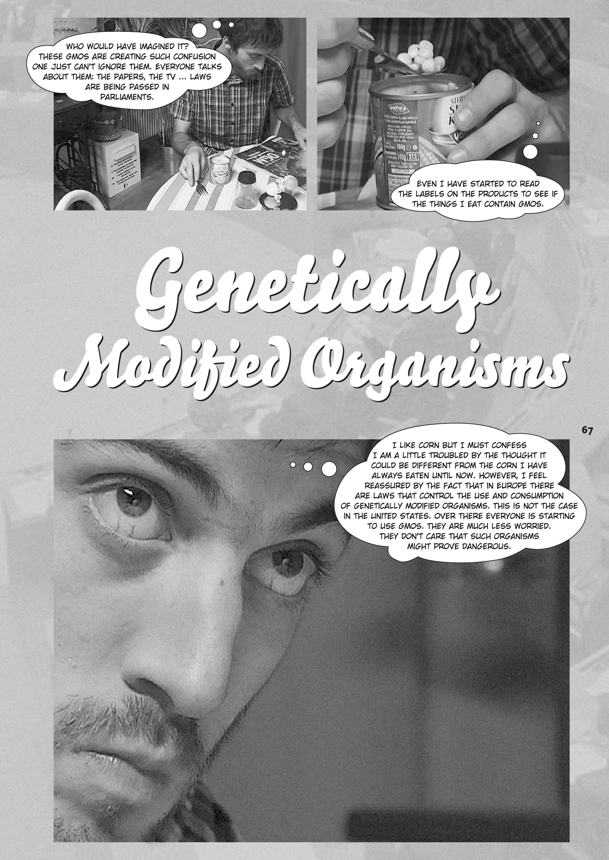Koruzo imam rad, toda priznati moram, da me skrbi, da bi bila lahko drugačna kot nekoč. Sicer se počutim zaščitenega, ker ima Evropa zakone, ki urejajo uporabo in potrošnjo gensko spremenjenih organizmov. V Združenih državah pa ni tako. Tam so jih začeli uporabljati vsi, saj si s tem ne delajo preglavic. Ne skrbi jih, da bi bili lahko nevarni. Kdo ve, kdo ima prav? Evropejci s svojo previdnostjo ali Američani s svojo nonšalnso. No, zaenkrat res še nisem slišal, da bi kdo zbolel, ker je jedel gensko spremenjeno hrano. Možno pa je, da mi je kaj ušlo.