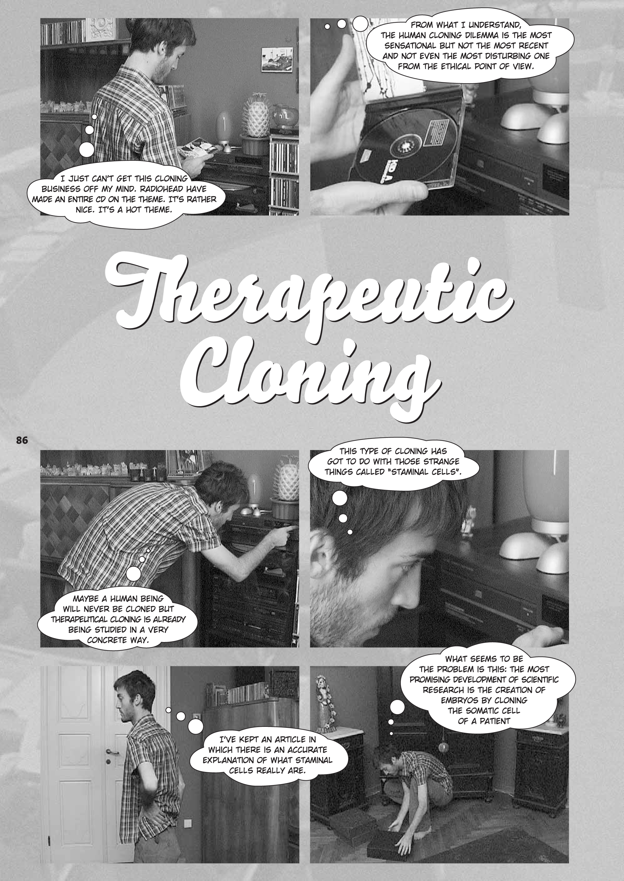 Stvar je seveda precej vznemirljiva. Kolikor jaz razumem, je vprašanje kloniranja človeka najbolj senzacionalno, ni pa tudi najbolj aktualno in morda tudi ne najbolj etično vprašljivo. Človeka morda ne bodo nikoli klonirali, medtem ko terapevtsko kloniranje že povsem konkretno raziskujejo. Pri terapevtskem kloniranju imamo opravka s temi nenavadnimi rečmi, ki se jim reče "zarodne celice".
