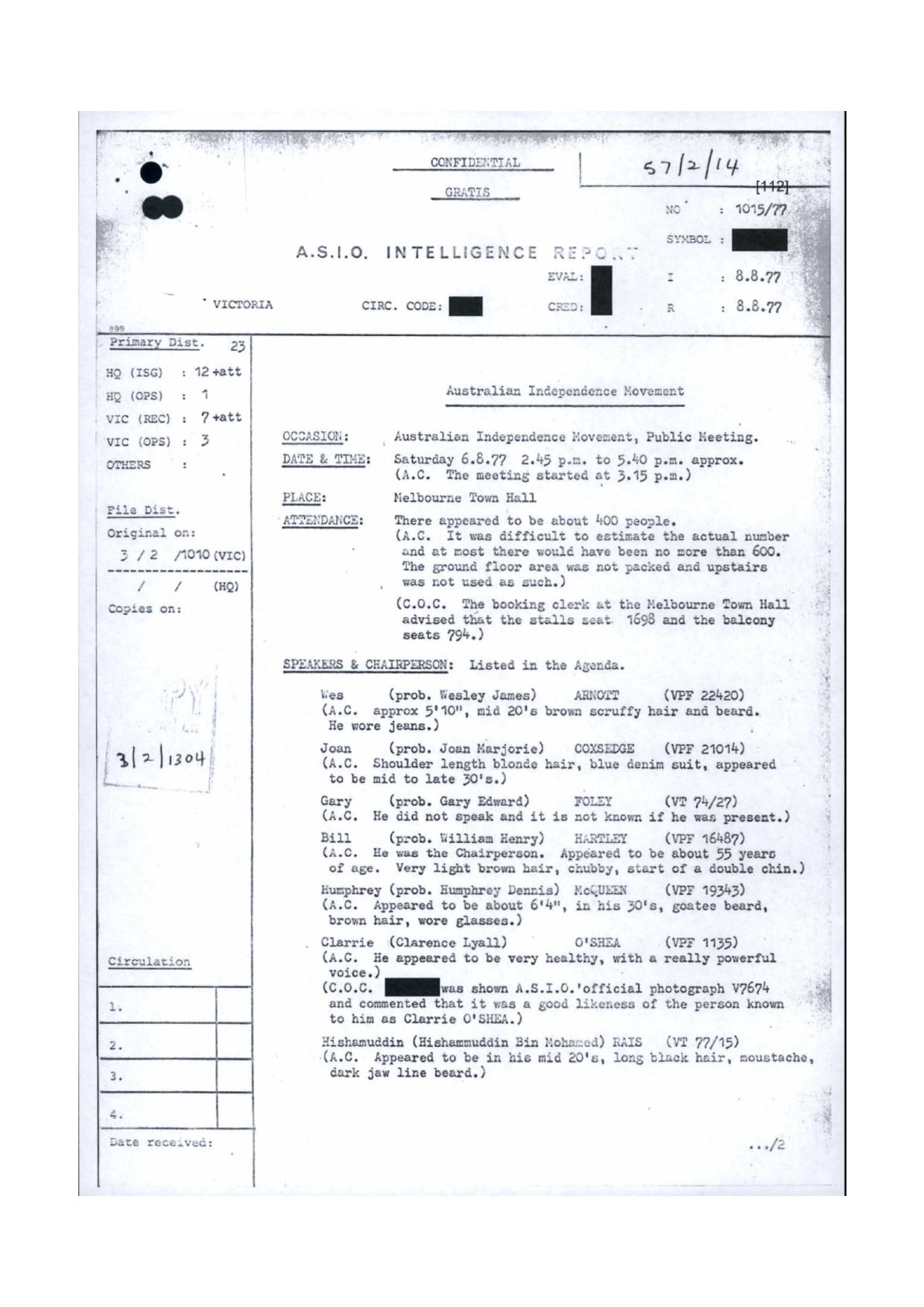 The initial work was presented as an installation within the gallery at Gertrude Contemporary, where it staged the dynamics of the secret, and spying. Focusing on a document detailing a meeting held in the Melbourne town hall in august 1977 organised by the Australian independence movement, attended by between 400 and 600 people, the sound of the recorded script being read was amplified through a set of very large speakers in a stack that were pointed towards a wall, but this sound could only be heard through the other side of the wall, by placing an ear to one of a set of glasses which had been permanently secured to the wall. This reworking for radio is a reading of the file as a script for two voices.