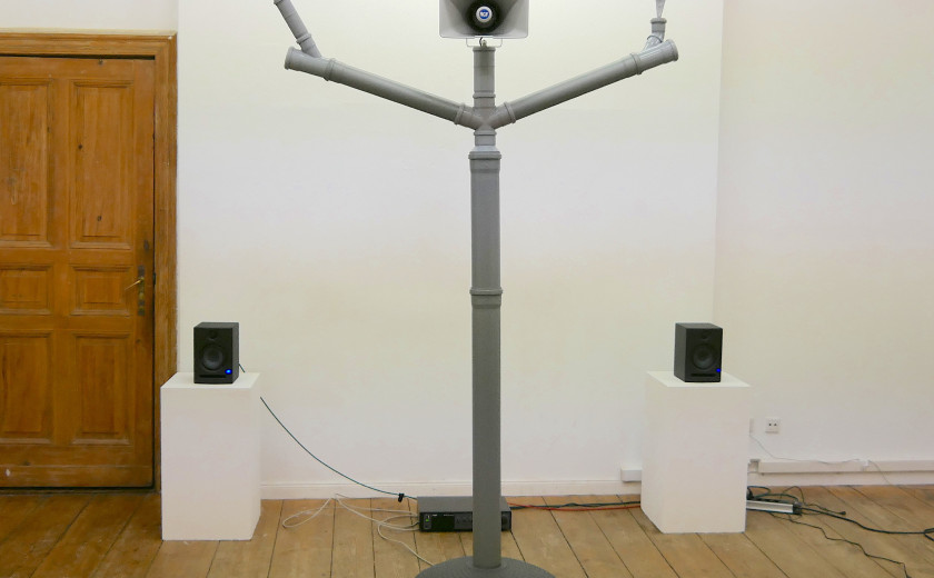 Korhan Erel made three computer voices spread over two speakers read this essay in parts. In between these parts, they inserted short sound compositions reminiscent of the computer sounds of the era, found-sound collages, snippets from Michel Foucault’s “The Culture of the Self” lectures at Berkeley (1983), and glitched versions of the manifesto in an effort to dig up and shine a new light on one of the first computer-era manifestos. The viewer experiences this sound piece by standing between two speakers pointed at each ear and in front of the printed manifesto.