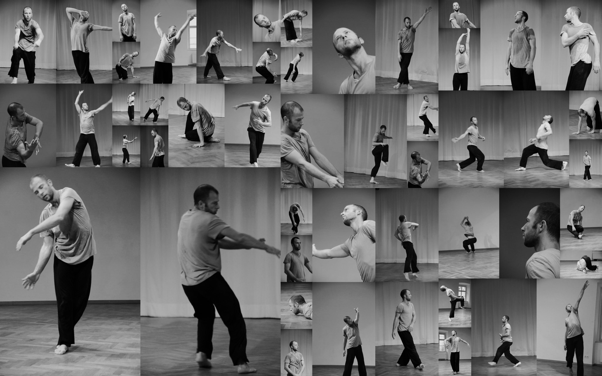 Nekateri deli so čisti Steve z mehkimi gibi in nenadnimi preobrati, ki jih zaznavam čez svojo hrbtenico. Ponekod je Konjar namenoma štorast. Hodi po petah. Pusti telesu, da pade na tla. Ko iščem vstop v posamezni prizor ali sekvenco, počnem to, kar je počel Konjar ob gledanju Paxtona, torej: ugotavljam, kaj žene plesalca v vsakem trenutku. Včasih vstopa v prizor ne ponudi spremljanje telesa, ampak poslušanje glasbe. Tako Konjar eno variacijo začne s karikiranim oponašanjem baročnih dvorskih plesov. Spet drugič glasba ni pomembna in se plesno telo ukvarja s svojo težo. V tretjem trenutku opazim okna dvorane in kako se ples povezuje z drevesom na dvorišču. Ali pa Jurijevo telo le leži na tleh. Diha. Tok plesa ima svojo logiko in Konjarjeva metoda je dopuščati, da ta stopi v telo.