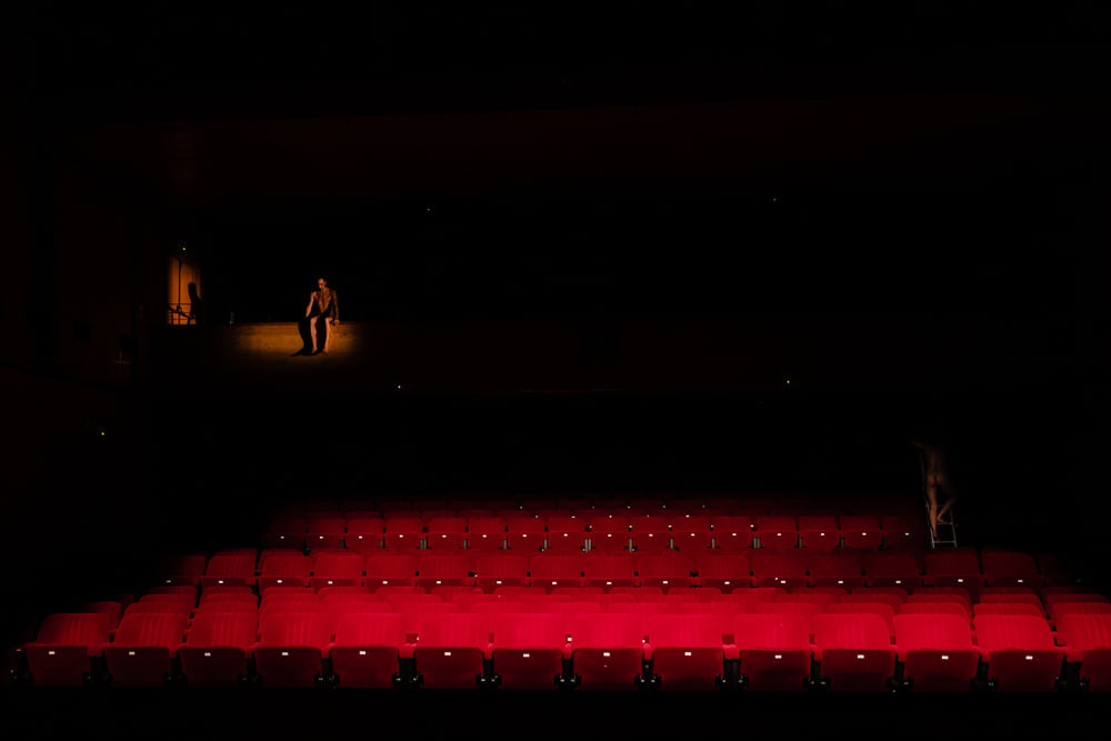 Občinstvo je posedeno na oder velke dvorane Španskih borcev in gleda v prostrano zaveso. Pred njo na levem koncu odra v žarometnem stožcu sedi glasbenik Tomaž Grom in uglašuje elektrificirani kontrabas. Ta z močnimi basi vibrira do te mere, da vibrirajo tudi vsi predmeti, ki z njegovim ogrodjem oziroma strunami stopijo v stik. Zavesa se nenadoma razgrne in v našem vidnem polju zažari rdeč deftin stolov praznega auditorija. Prva v vrsti trinajstih slik, ki jih med seboj loči razpiranje in zastiranje gledališke zavese, dokler se ta ne zapre. Ko se nam ponovno razpre pogled v dvorano, v njej opazimo okončine dveh golih teles, ki se sprva počasi valjata čez stole, v naslednji sliki pa se počasi gibata po labirintu, ki ga tvorijo koridorji med praznimi sedišči.