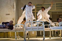 Absurdni vrvež zapolnjujejo nenadoma plešoči zdravniki, spastični pacienti, obešenjaški humor, prototipski vratar, pribežniki s psihiatričnega oddelka, srce parajoča dejanja dementnih starčkov, skratka izpopolnjena mizanscenska dinamika, ki kot za šalo vrtinči domete absurda, realnega, fantastičnega, grotesknega in dokumentarnega. Sporadično se v ta odrski cirkuško-birokratski kozmos vpenjajo posnetki reševalcev, farmacevtov in patologov, ki s simbolnim vdorom iz konkretnega, resničnega sveta odrsko iluzijo prebijajo z ostrino lastnih stvarnih izkušenj. Drobljenje različnih elementov in estetik je »kirurško« natančno, s čimer je kritika na dvoličen sistem zdravstva na eni strani premetena, zakodirana, zavita v nenehne ovoje večplastnega humorja in »zdrave distance«, a je na drugi strani prav v svoji komičnosti in cinizmu tudi tragična. V vsakem primeru pa prav zaradi neštetih absurdnih situacij tako zelo blizu realnemu stanju.