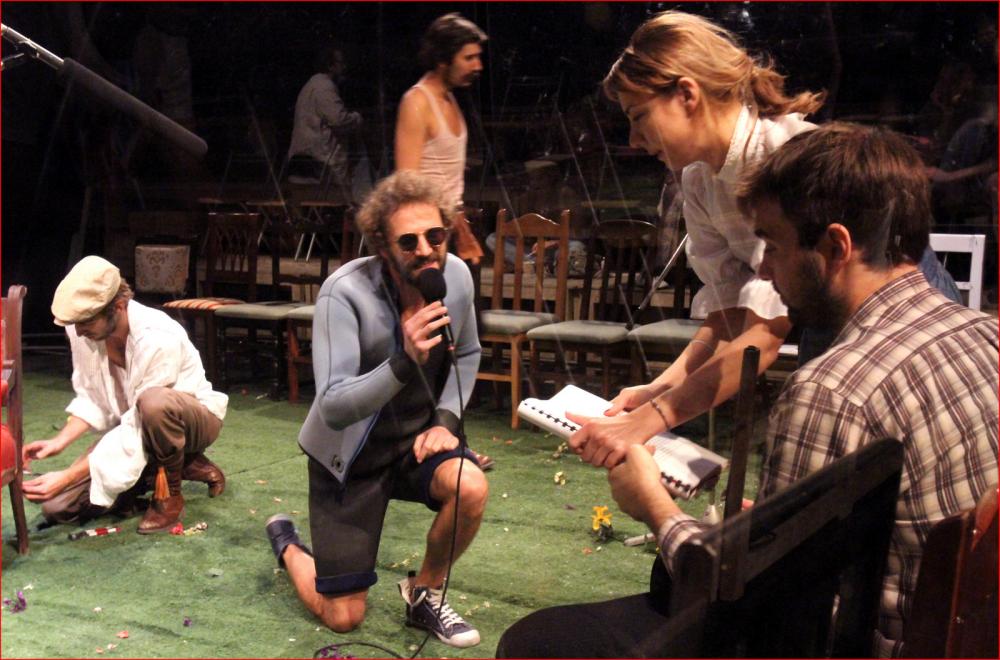Prvo dejanje se vzpostavlja kot večna vaja, o čemer priča tudi vpletenost režiserja, ki posega v postopek dogajanja ali nanj opozarja. Poleg tega je besedilo prav tako ves čas prisotno na dobesedni ravni, in sicer preko dveh igralk z vlogama šepetalk, s katerima preostali igralci vstopajo v razmerje, s tem pa že v razmerje do lastne vloge. Vmes vdirajo zvočni posnetki z vaj, v katerih so ujeti komentarji ali pogovori igralcev. Sam proces nastajanja predstave je tako pretvorjen v podobo oziroma postane uprizoritveno sredstvo, kako se spretno in z živostjo lotiti različnih tem v besedilu. Te se v veliki meri odkrito tičejo gledališča, razmerja med življenjem, ustvarjalnostjo in obliko ter nepredvidljivih človeških odnosov.