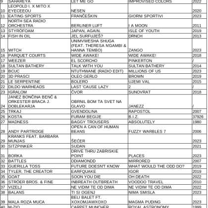 Seznam skladb za 26. 12. 2023, 15.00–19.00 (Luka Bevk)