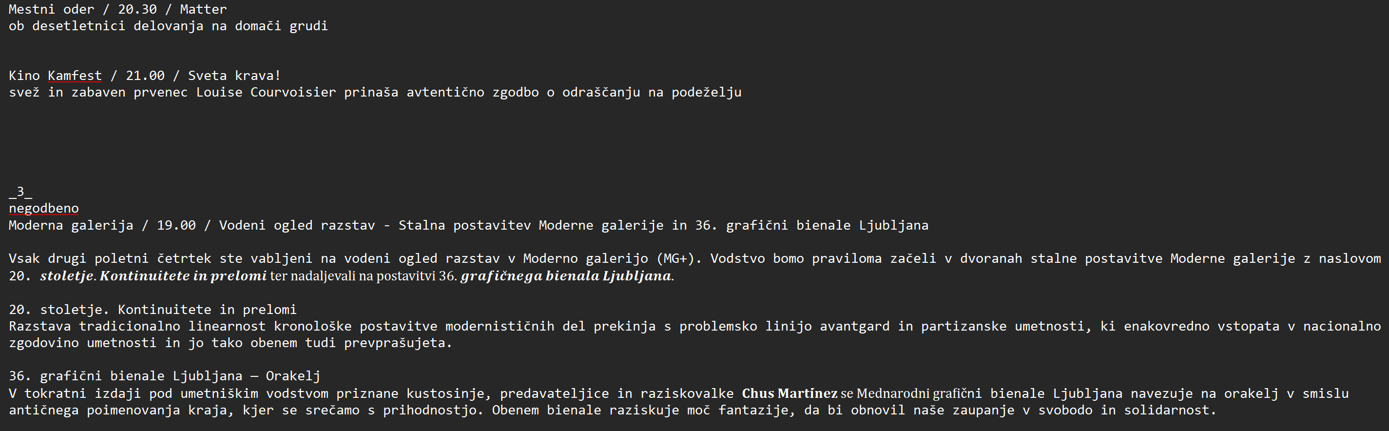 Vsak drugi poletni četrtek ste vabljeni na vodeni ogled razstav v Moderno galerijo (MG+). Vodstvo bomo praviloma začeli v dvoranah stalne postavitve Moderne galerije z naslovom 20. 𝒔𝒕𝒐𝒍𝒆𝒕𝒋𝒆. 𝑲𝒐𝒏𝒕𝒊𝒏𝒖𝒊𝒕𝒆𝒕𝒆 𝒊𝒏 𝒑𝒓𝒆𝒍𝒐𝒎𝒊 ter nadaljevali na postavitvi 36. 𝒈𝒓𝒂𝒇𝒊𝒄̌𝒏𝒆𝒈𝒂 𝒃𝒊𝒆𝒏𝒂𝒍𝒂 𝑳𝒋𝒖𝒃𝒍𝒋𝒂𝒏𝒂.
