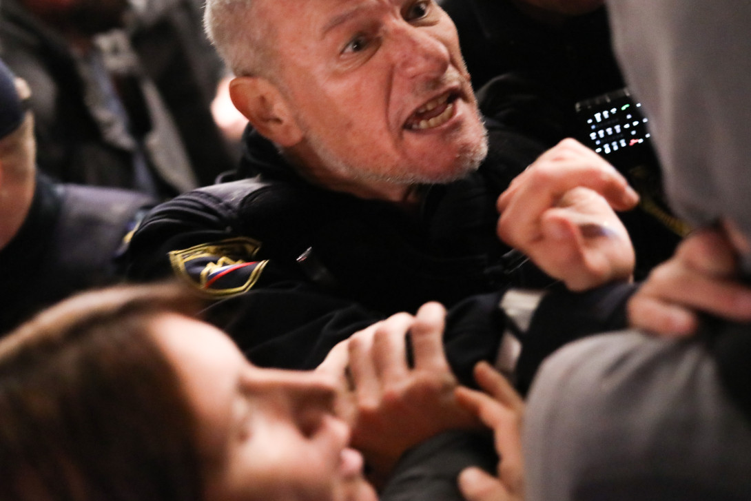 Vrh dramskega trikotnika se je zgodil včeraj popoldne pred elitnim Jankovićevem Rogom, ko je vesele protestnike pretepala in s solzivcem špricala Policija, medtem ko so se elitni povabljenci znotraj brezdušnega Jankovićevega Roga mastili s kranjsko klobaso in čufti ter nazdravljali s, citiramo, ˝ne preveč dobrim vinskim izborom˝.