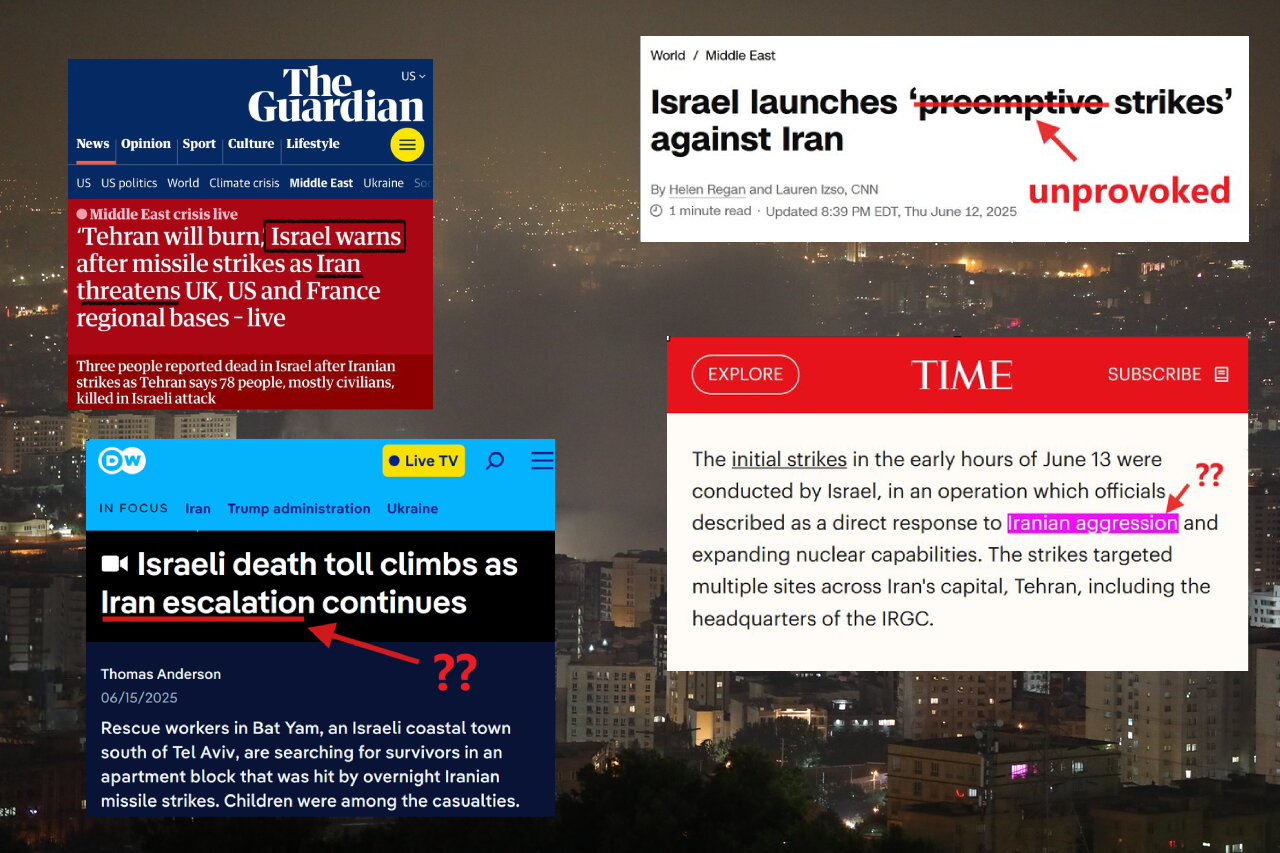 V sredini junija je izraelska vojska izvedla napad na Iran. Zahodni mediji so o tem poročali brez jasne opredelitve agresije, brez zgodovinskega ali političnega ozadja in brez preizpraševanja legitimnosti napada. Dogodek je bil predstavljen kot nadaljevanje dolgo trajajočih napetosti, Iran pa kot vir nestabilnosti, ki utegne »eskalirati«, pa čeprav tisti, ki je napaden. Civilne žrtve, uničenje infrastrukture, vključno z državno televizijo IRIB, in pravna vprašanja so bili bodisi izpuščeni bodisi potisnjeni na rob. Tovrsten diskurz je prevladoval tudi v slovenskih medijih.