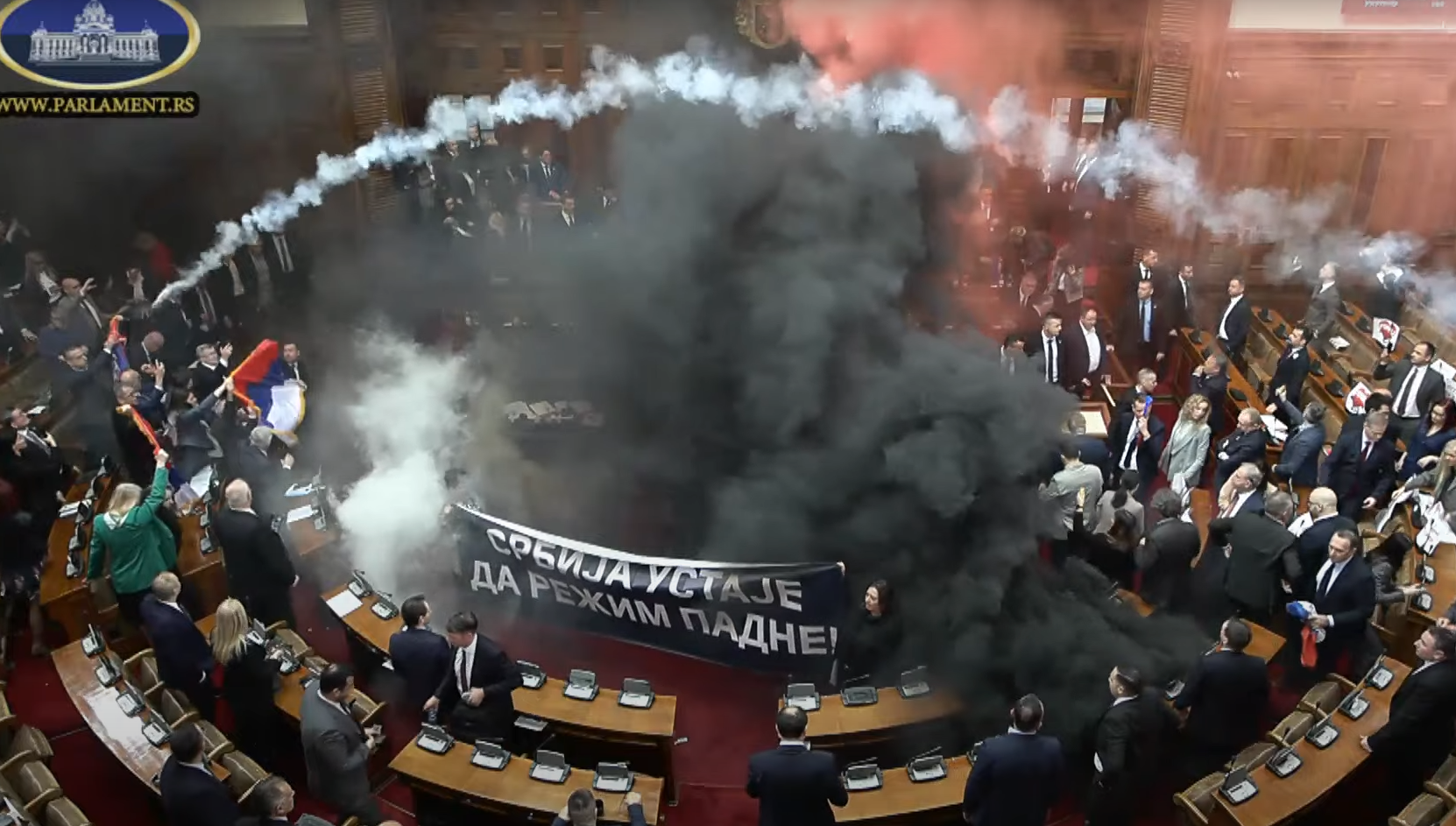 Na redni seji srbskega parlamenta je po glasovanju o dnevnem redu prišlo do pretepa, metanja jajc in metanja dimnih bomb. Opozicijski poslanci so na sejo prišli s protestnimi transparenti in najprej s piščalkami in trobljami motili govore poslancev koalicijskih Srbske napredne stranke in Socialistične partije Srbije. Predsednica parlamenta Ana Brnabić je to označila za kratenje svobode govora koalicijskim poslancem.