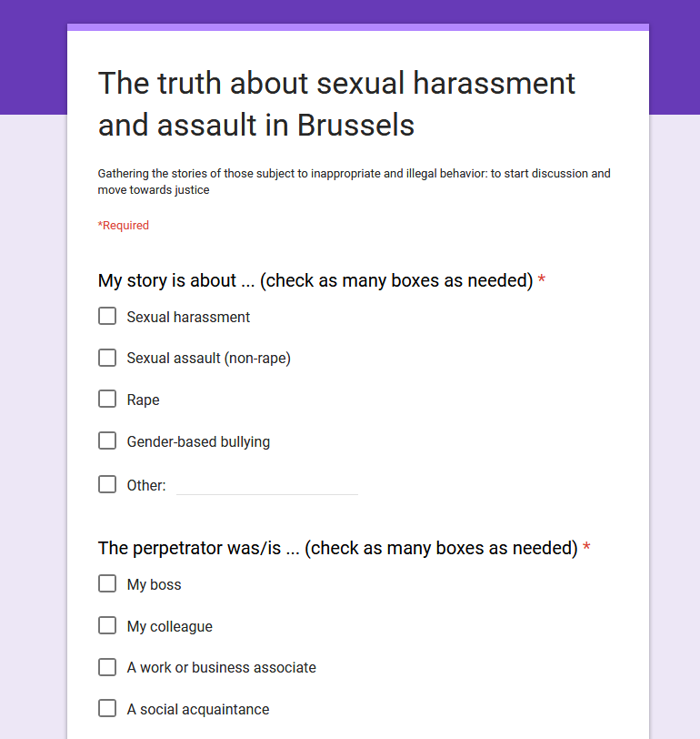 Pet evropskih poslancev zahteva zunanjo preiskavo obtožb o spolnem nadlegovanju znotraj Evropskega parlamenta in vzpostavitev posebnega odbora za spolno nadlegovanje, sledeč objavi poročila o spolnih zlorabah ženskega osebja v Sunday Times. Medtem je portal Politico Europe ustvaril posebno spletno stran, na kateri je mogoče oddati pričevanje o spolnem nadlegovanju v Evropskem parlamentu. Na ta način je do sedaj pridobil pričevanja 87 žensk in 6 moških. Nekatera izmed njih poročajo o zahtevanih spolnih uslugah v zameno za podporo zaželenim zakonodajnim spremembam ali v zameno za pogodbo o zaposlitvi.