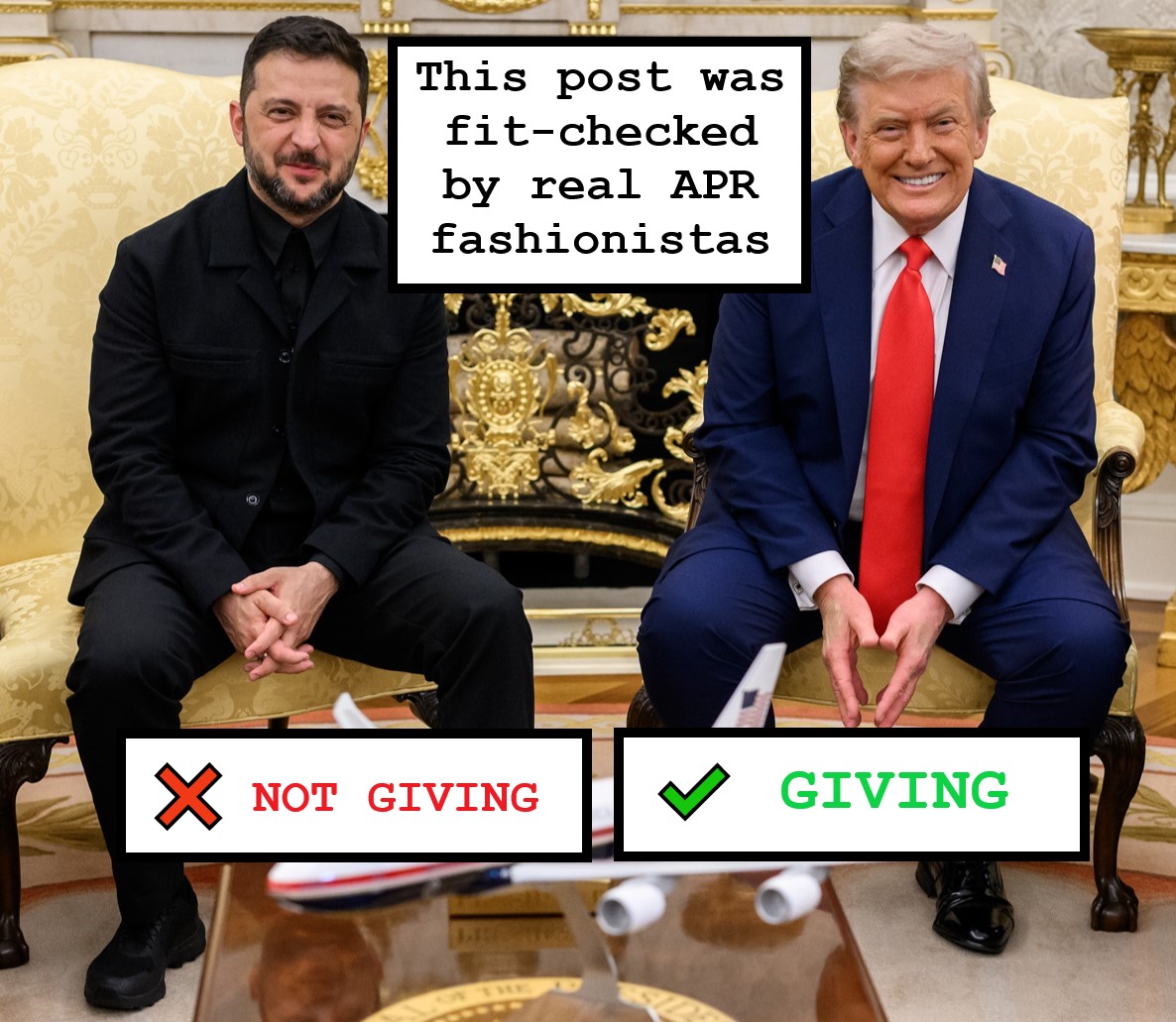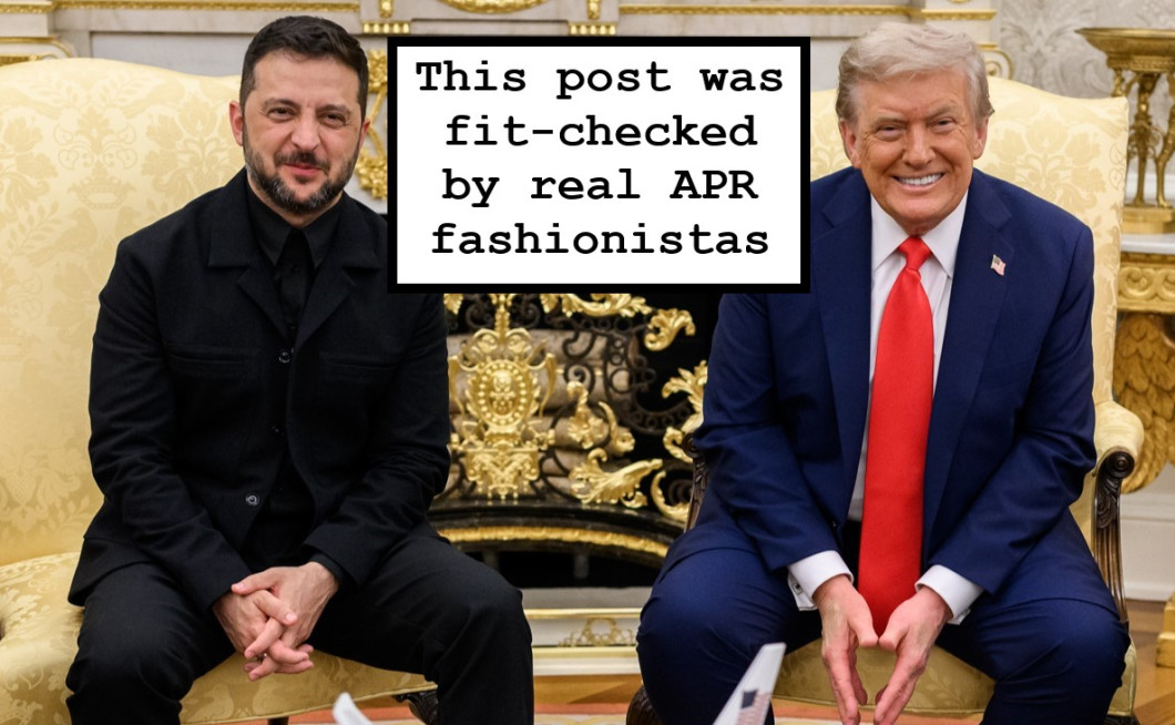 Po srečanju z ruskim predsednikom Vladimirjem Putinom se je ameriški predsednik Donald Trump sestal še z ukrajinskim predsednikom Volodimirjem Zelenskim. Poleg Zelenskega so se pogovora udeležili še predsednica Evropske komisije Ursula von der Leyen, nemški kancler Friedrich Merz, francoski predsednik Emmanuel Macron, britanski premier Keir Starmer, generalni sekretar Nata Mark Rutte, finski predsednik Alexander Stubb ter italijanska premierka Giorgia Meloni. Ameriški predsednik Donald Trump je dejal, da so se dogovorili za varnostne garancije Ukrajini po premirju. H garancijam bi se zavezale evropske države, Združene države Amerike pa bi zgolj koordinirale njihovo sprejetje. Napovedal je tudi srečanje med Zelenskim in Putinom v naslednjih dveh tednih, česar pa ruska vlada še ni potrdila. Zelenski je upošteval pritožbe z zadnjega srečanja in namesto v temno zelenem vojaškem puloverju na srečanje s Trumpom prišel v črnih hlačah, črni srajci in črni jakni, ki je spominjala na bolj ceremonialno vojaško uniformo, vendar še vedno brez kravate. Trump je novi outfit Zelenskega pohvalil rekoč, da izgleda fantastično, Zelenski pa je opazil, da sta Trump in novinar Brian Glenn, ki je februarja Zelenskemu prvi postavil vprašanje o obleki, še vedno oblečena enako kot prejšnjič. Aktualnopolitična redakcija je ob tej priložnosti namesto factchecka naredila fitcheck in ugotovila, da Zelenskemu bolj pristaja zeleni pulover.