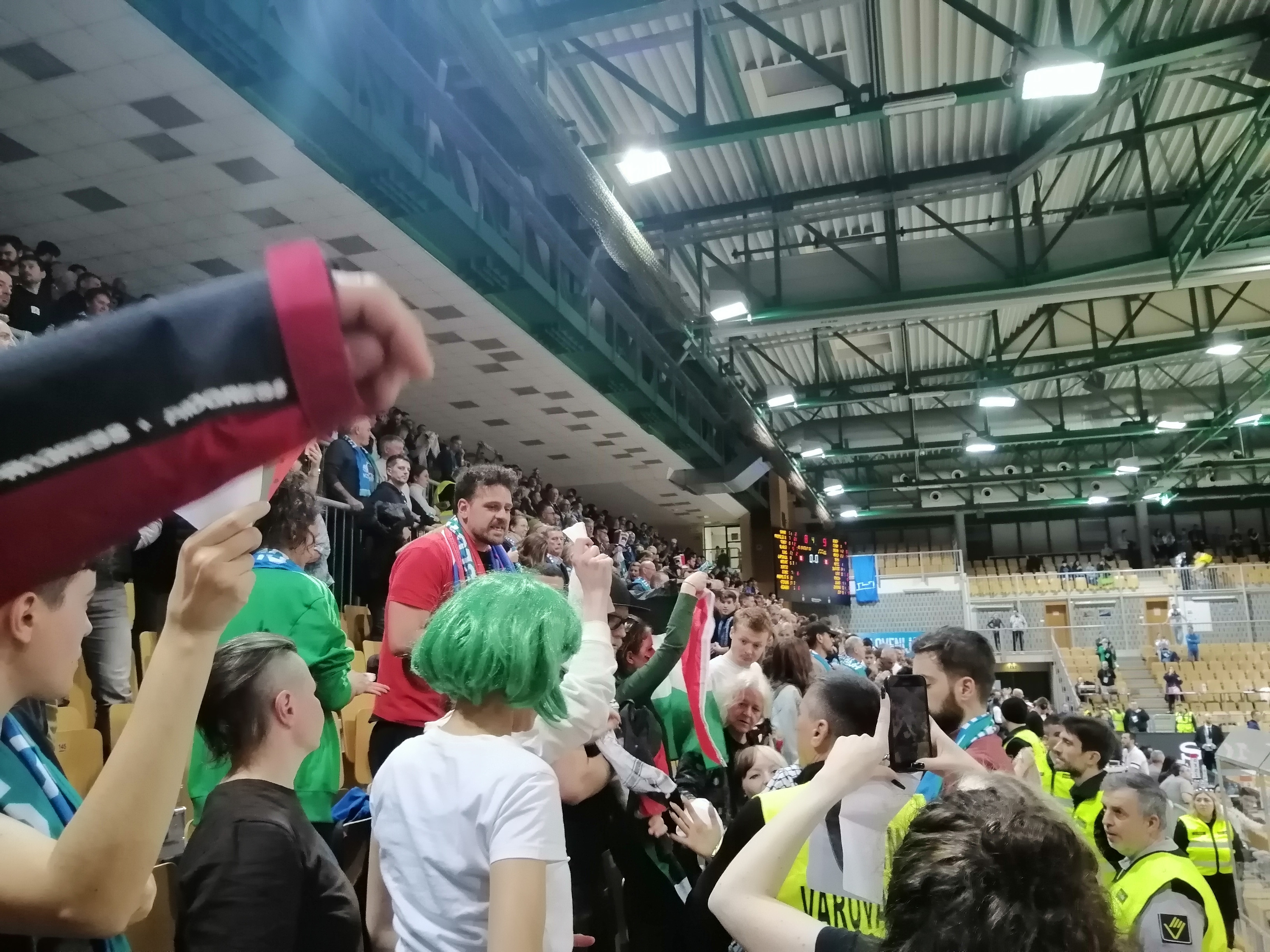 Varnostniki, ki jih je najela košarkarska zveza, so skušali kar se da natančno izpolnjevati prepovedi. Listov papirja z naslikanimi lubenicami, simbolom podpore Palestini, varnostniki niso zasegli. Prav tako so dopuščali mahanje z rdečimi listi papirja, ki so predstavljali rdeče kartone za izraelski genocid. Okrog deset palestinskih zastav, ki so jih protestniki uspeli prešvercati v dvorano, so varnostniki zasegli, kaj hitro jim je to uspelo. Transparente s slogani, kot je »Slovenija proti genocidu«, prav tako. To jih je tako zamotilo, da je Franci Kek uspel s kefijo oziroma ruto skočiti na igrišče.