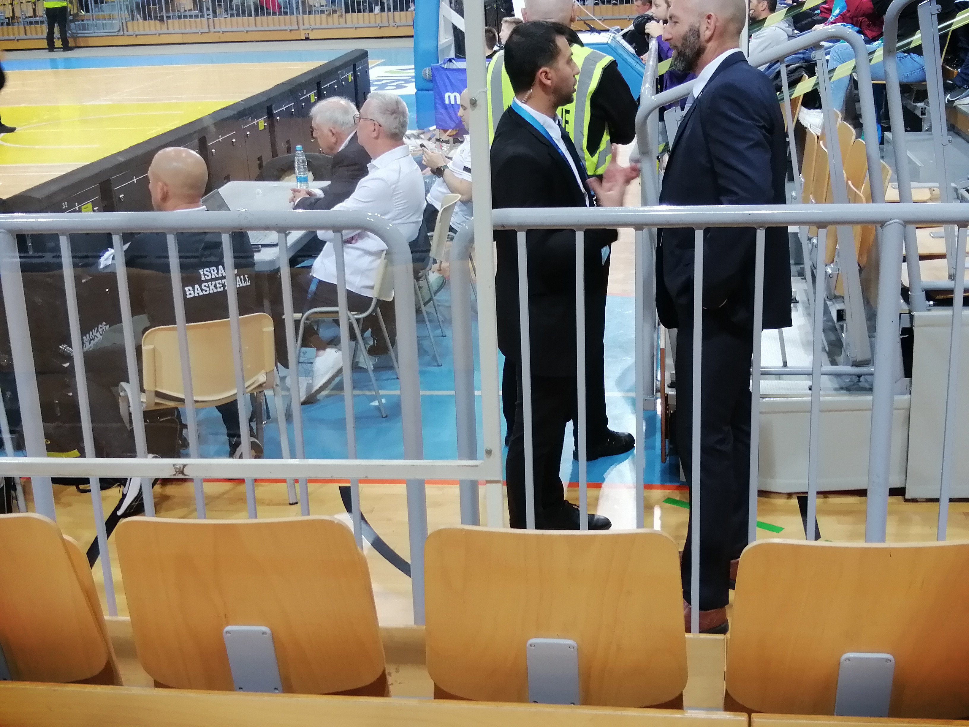 Andraž opozarja na varnostnike v poslovnih oblačilih, ki so za vratom nosili akreditacijo izraelskega košarkarskega štaba: