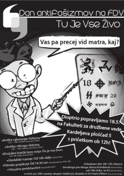 Na Fakulteti za družbene vede so prepoznali nujo po širši refleksiji in tako so nekateri predavatelji in študenti v sodelovanju z vodstvom fakultete 18. maja organizirali dogodek z naslovom „Dan antifašizmov“. Že sama uporaba množine da vedeti, da je treba fašistične politike prepoznati na različnih ravneh in poljih. Dan je bil mišljen kot skupek predavanj in zabave. Ker je bilo predavanj za več ur, nato pa je potekala še odprta debata, se bomo osredotočili na določene dele predavanj, ki se dotikajo zgodovine neonacističnih skupin v Sloveniji, povezanosti raznih takšnih skupin v sedanjosti, nevarnosti fašizma in povezavi le-tega s položajem delavcev.