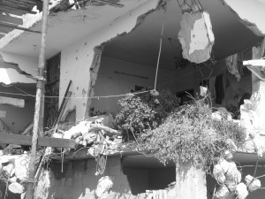 Sicer velika hiša, v kateri so živele tri družine, je skorajda popolnoma porušena, stebri, ki so nekoč držali pokonci tretjino stavbe, so izgubili stik s tlemi, a hiša se zaenkrat še upira gravitaciji. V ta del Gaze je v času operacije „Cast Lead“ vdrla izraelska vojska in se znesla nad prebivalci, ki se večinoma ukvarjajo s kmetovanjem. V hišo, v kateri družina Al Louh še vedno živi, so streljali s tanki in jo dodatno poškodovali z buldožerji. Nekaterih zunanjih sten preprosto ni več, tako da mora zaradi številčnosti del družine spati v prostoru, ki je bil nekoč soba, sedaj pa ga od zunanjega sveta le improvizorično delijo obešene deke in kosi blaga. Stene po celi hiši so razpokane, tako zunaj kot znotraj pa so vidne luknje od metkov in projektilov izraelske vojske. Zakaj je bila med tarčami tudi ta hiša, ni jasno, saj ni okoli nikakršnih vojaških ali policijskih objektov. Ob ruševinah se s pomočjo vlade gradi nova hiša, a le z enim nadstropjem, kar je premalo za vse, ki so prej skupaj bivali v porušeni hiši. A družina Al Louh je imela v primerjavi z družino Abu Halima srečo, saj ni v napadu umrl nihče. Pri Abu Halimovih je zgodba precej bolj tragična. 10 mrtvih članov družine, od tega 5 otrok. Med preživelimi je 5 letna Farah, ki je imela v času vojne 2 leti. Na precejšnjem delu njenega telesa so vidne opekline, ki jih je povzročil beli fosfor, snov, ki jo je izraelska vojska v ofenzivi množično uporabljala nad civilnimi območji. Farah še vedno mučijo nočne more, trpi za inkontinenco, rane od opeklin jo srbijo in redno mora obiskovati zdravnika. Njen oče, ki je v vojni izgubil ženo, očeta in štiri brate, je na vprašanje, kako dojema politično dogajanje v Palestini, hladno odvrnil, da ga v življenju zanima samo še zdravje in blagostanje njegove družine. V hiši je na več mestih obešen plakat s fotografijami umrlih sorodnikov. Med njimi sta tudi Farahina bratranca, ki sta hotela svojo sestrično odpeljati v bolnišnico s traktorjem, ker reševalnega vozila ni bilo. Na poti so srečali izraelski tank, vojaki pa so ju ubili oziroma likvidirali na licu mesta. A izraelska vojska ni uničevala samo življenj in privatnih hiš. Ob morju tik ob peščeni plaži ležijo ruševine ogromnega objekta, ki bi moral postati hotel.