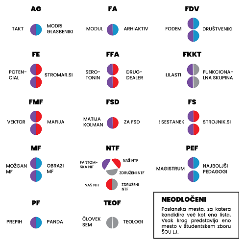 Študenti in študentke bodo poslance, ki bodo zasedli 23 še nerazdeljenih poslanskih mest v študentskem zboru, izbirali na 14 od skupno 29 fakultet. Na preostalih 15 fakultetah za posamezno poslansko mesto kandidira le po ena kandidatka oziroma kandidat, ki bo v študentski zbor izvoljen že z enim glasom podpore. Tako je 19 poslanskih mest v študentskem zboru dejansko razdeljenih že pred volitvami, eno, do zdaj povezano poslansko mesto, pa bo ostalo prazno, saj Fakulteta za državne in evropske študije, krajše FDŠ, nima kandidatke ali kandidata za poslanca.