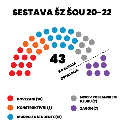 O razmerju moči v prihajajočem mandatu študentskega zbora bodo na letošnjih volitvah tako odločili študenti in študentke. Ne Povezani, ne Modri in ne kandidati blizu trenutne opozicije namreč še nimajo zagotovljene ene tretjine glasov. To pušča odprte tudi različne možnosti glede povolilnega povezovanja poslancev v poslanske klube in sestavljanja koalicije. Na volitvah bo kandidiralo vsega 23 kandidatov za poslance, ki niso povezani s trenutnima koalicijskima strankama Povezani in Modro za študente. Odločilno bo lahko še povezovanje poslancev fakultete za kemijo in kemijsko tehnologijo, teološke fakultete in samostojne kandidatke na filozofski fakulteti. Poslušalce vabimo, da si na naši spletni strani pod posnetkom oddaje ogledajo grafične prikaze, ki smo jih pripravili za lažje razumevanje trenutnih in projekcijo prihodnjih razmerij v Študentskem zboru ŠOU v Ljubljani.