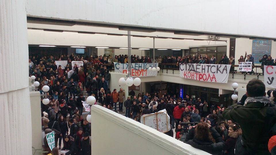 Začnimo v tujini. Makedonski študenti, združeni v organizacijo Študentski plenum, so v preteklem tednu zasedli več fakultet širom države. Nasprotujejo sicer že sprejetemu zakonu o visokem šolstvu, ki predvideva zunanje preverjanje znanja na vsaki dve leti. S tem bi država grobo posegla v neodvisnost fakultet in soodoločala, kateri študentje smejo uradno zaključiti študij in pridobiti diplomo. Študentje in nekateri zaposleni temu ostro nasprotujejo ter se pri tem sklicujejo na avtonomno in kakovostno šolstvo. Poleg zakona tamkajšnje visoko šolstvo pestijo tudi finančne težave, neurejeno napredovanje profesorjev in slaba implementacija bolonjskega sistema. Za krajši oris dogajanja smo poklicali predstavnika študentov, Željkota iz Študentskega plenuma. Kolegom v Makedoniji izražamo podporo in jim želimo veliko borbenosti v nadaljnjih tednih!
