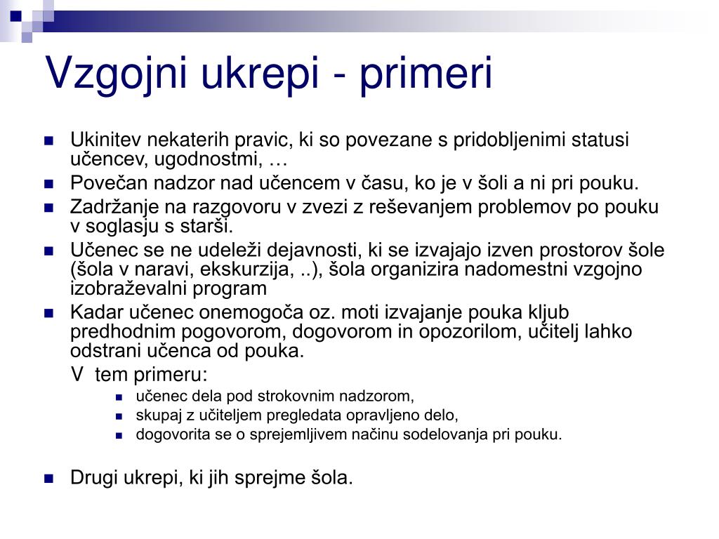 Noveli prav tako dajeta učitelju možnost, da prepove prisotnost pri uri pouka dijaku, ki bistveno ovira izvajanje pouka. Ponovno se uvaja tudi stopnjevanje vzgojnih ukrepov. Dijaki na gimnazijah bodo lahko izključeni iz šole, če se jim izreče peti ukor, medtem ko bodo dijaki na srednjih poklicnih in strokovnih šolah izključeni že po izrečenem četrtem ukoru. Polnoletni dijaki bodo lahko še vedno zahtevali, da šola staršem določenih podatkov ne razkrije, a le, če mu zaradi tega ne grozi izguba statusa dijaka.