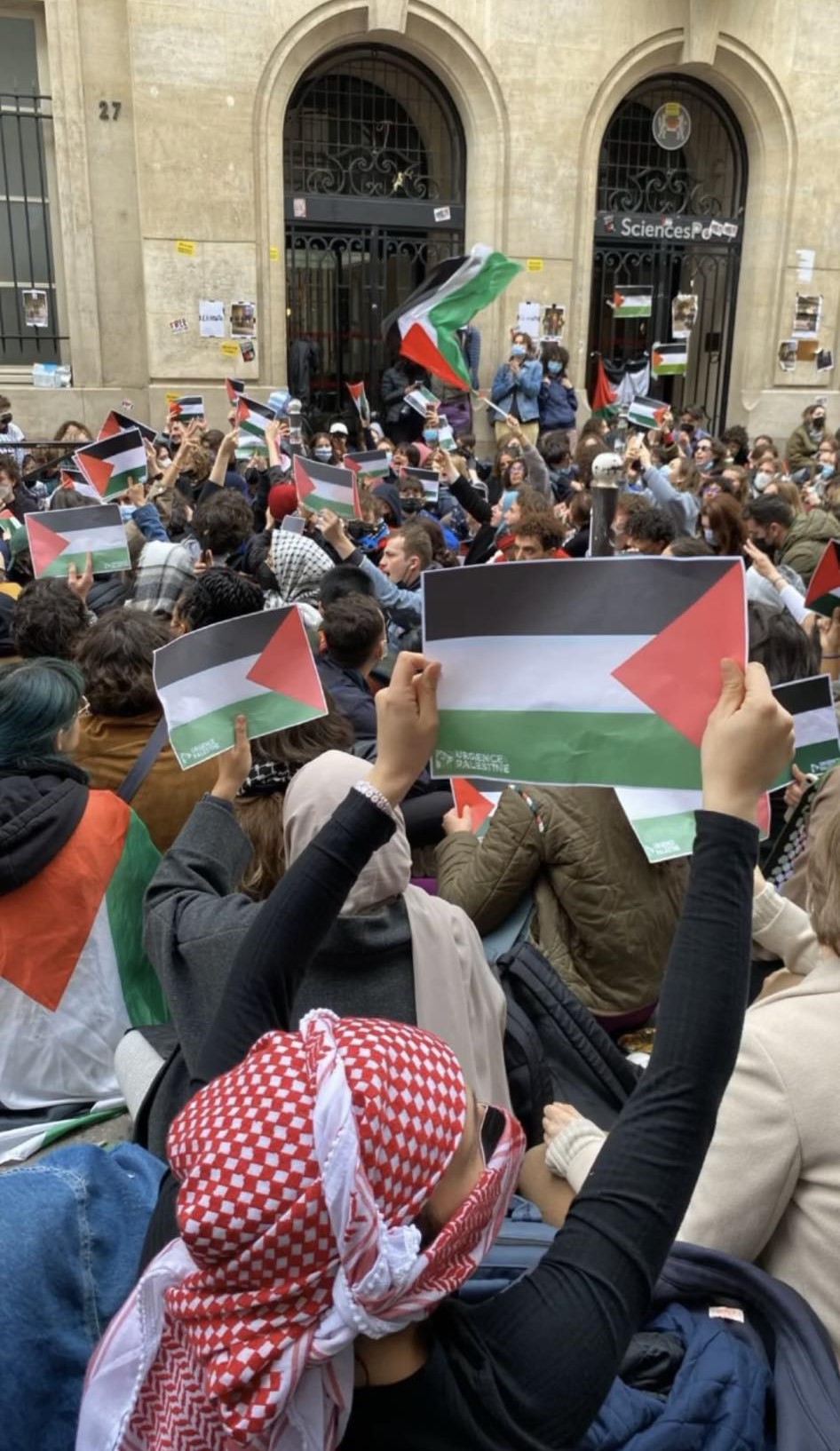 Tako je 26. aprila odmevalo pred prestižno univerzo Sciences Po v Parizu, kjer so po vzoru študentov ameriških univerz tudi francoske študentke z zasedbo kampusa zahtevale konec genocida v Gazi in prekinitev vseh vezi univerze z Izraelom.