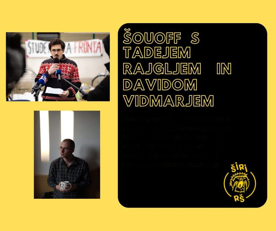 Sezono ŠOUoff intervjujev s študentskimi poslankami in poslanci nadaljujemo s pogovorom s Tadejem Rajgljem in Davidom Vidmarjem, predstavnikoma Medicinske fakultete v študentskem zboru ŠOU v Ljubljani.
