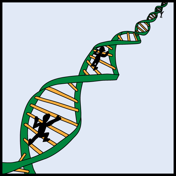 Za začetek bomo razložili osnovne pojme, okrog katerih bo nocoj tekla beseda. Deoksiribonukleinska kislina ali na kratko DNK je verižna molekula, ki se nahaja v jedru evkariontskih celic in nukleoidu prokariontskih celic ter nosi naš dedni zapis. Sestavljena je iz dveh zelo dolgih verig, ki se ovijata ena okrog druge. Zato pravimo, da ima DNK obliko dvojne vijačnice. Vsaka od verig je sestavljena iz štirih osnovnih gradnikov, imenovanih nukleotidi. Gre za relativno majhne organske molekule, ki so sestavljene iz treh komponent - anorganske fosfatne skupine, sladkorja riboze ter organske dušikove baze. Poenostavljeno nukleotide poimenujemo kar po organskih dušikovih bazah, in sicer adenin, timin, citozin in gvanin, na kratko A, T, C in G. Molekula DNK se tako zdi kot zelo dolga beseda, sestavljena iz štirih različnih črk.