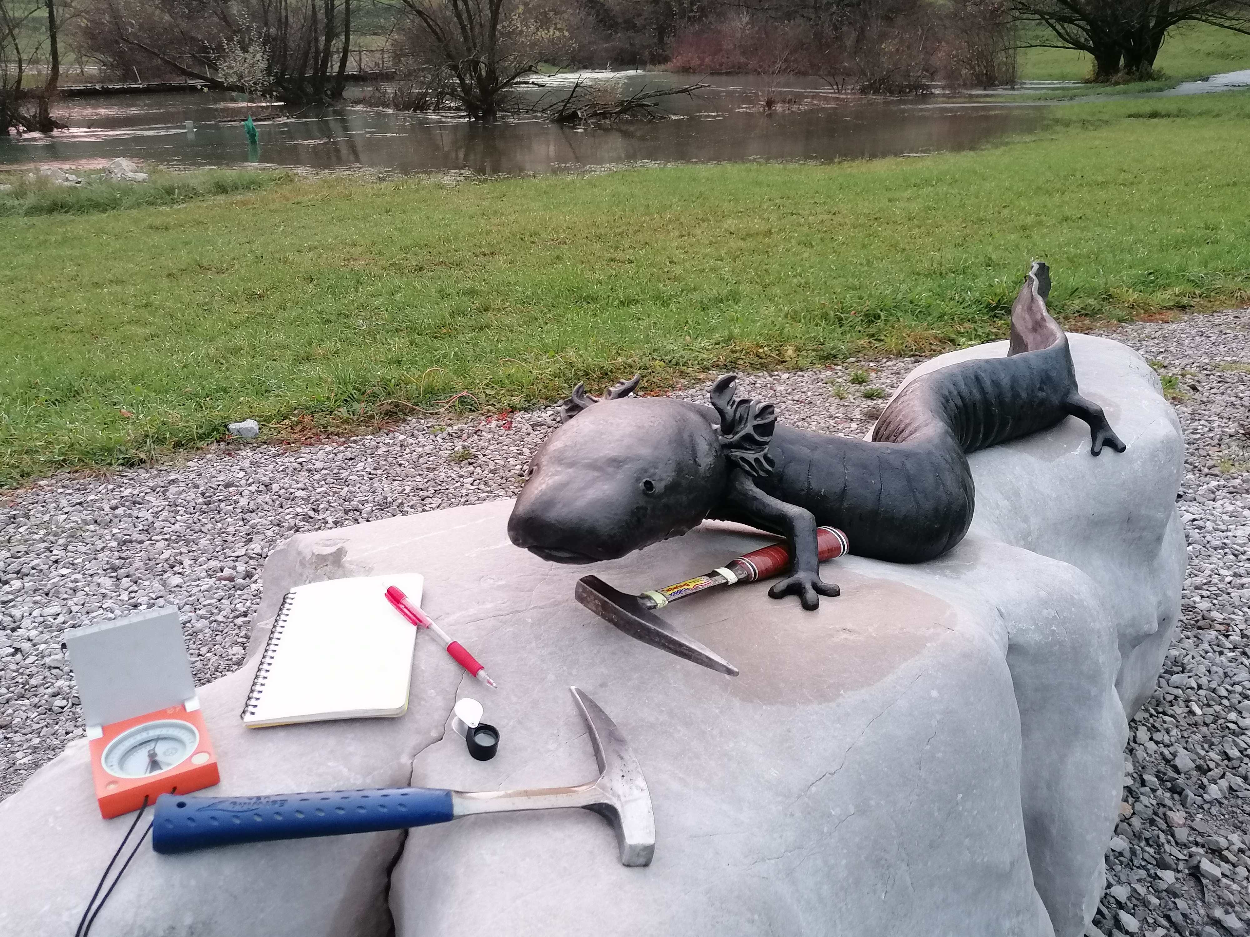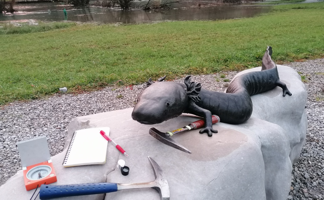Da, prav ste slišali. Kamnine geologi razbijamo. Za tako početje potrebujemo zvestega spremljevalca vsakega kamnoljuba, in to je geološko kladivo. Poleg tega na terenu potrebujemo že večkrat omenjeno karto, geološki kompas, lupo, terenski dnevnik, klorovodikovo kislino ter primerna oblačila in obutev. Tako spodobno opremljena sva se z Markom od izvira Jelševniščice sprehajala vzdolž reke ter razbijala in popisovala kamnine.