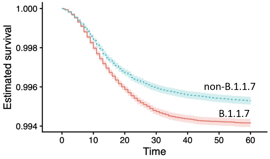 Vir: Davies, N.G., Jarvis, C.I., CMMID COVID-19 Working Group. et al. Increased mortality in community-tested cases of SARS-CoV-2 lineage B.1.1.7. Nature (2021).